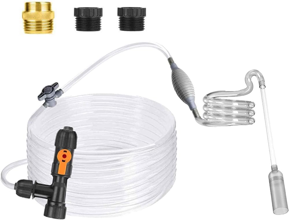 مكنسة كهربائية سيفون لحوض السمك لتنظيف الحصى والرمل. تحتوي على مجموعة تنظيف الحصى بطول 5.5 قدم مع مضخة هواء يدوية. عند التصريف، قم بتحريك الحصى بلطف لإزالة البقايا. لن يزعج الأسماك أو الديكور عند العمل.