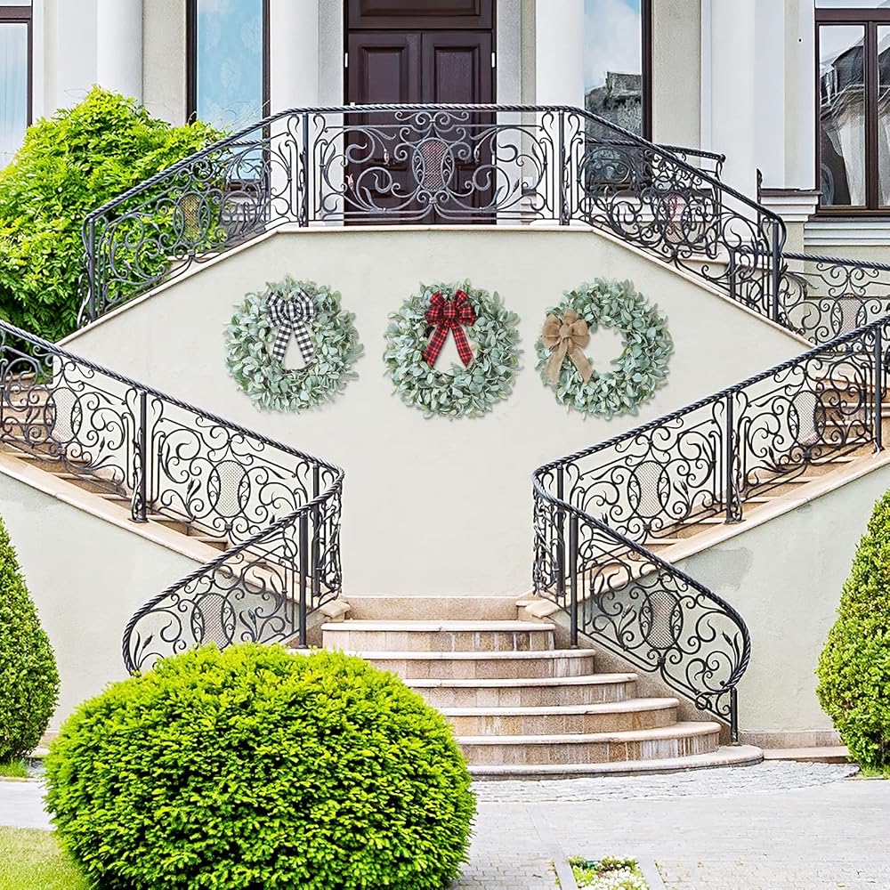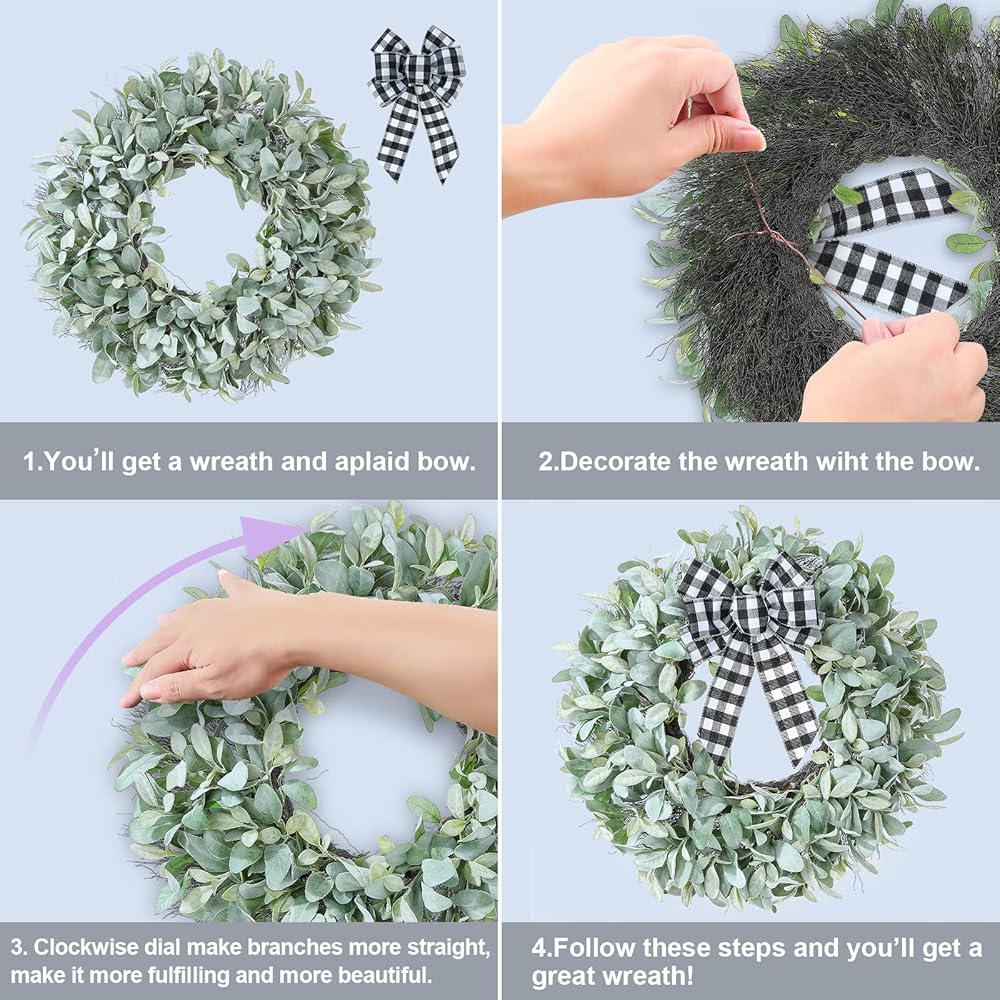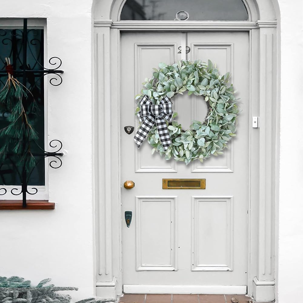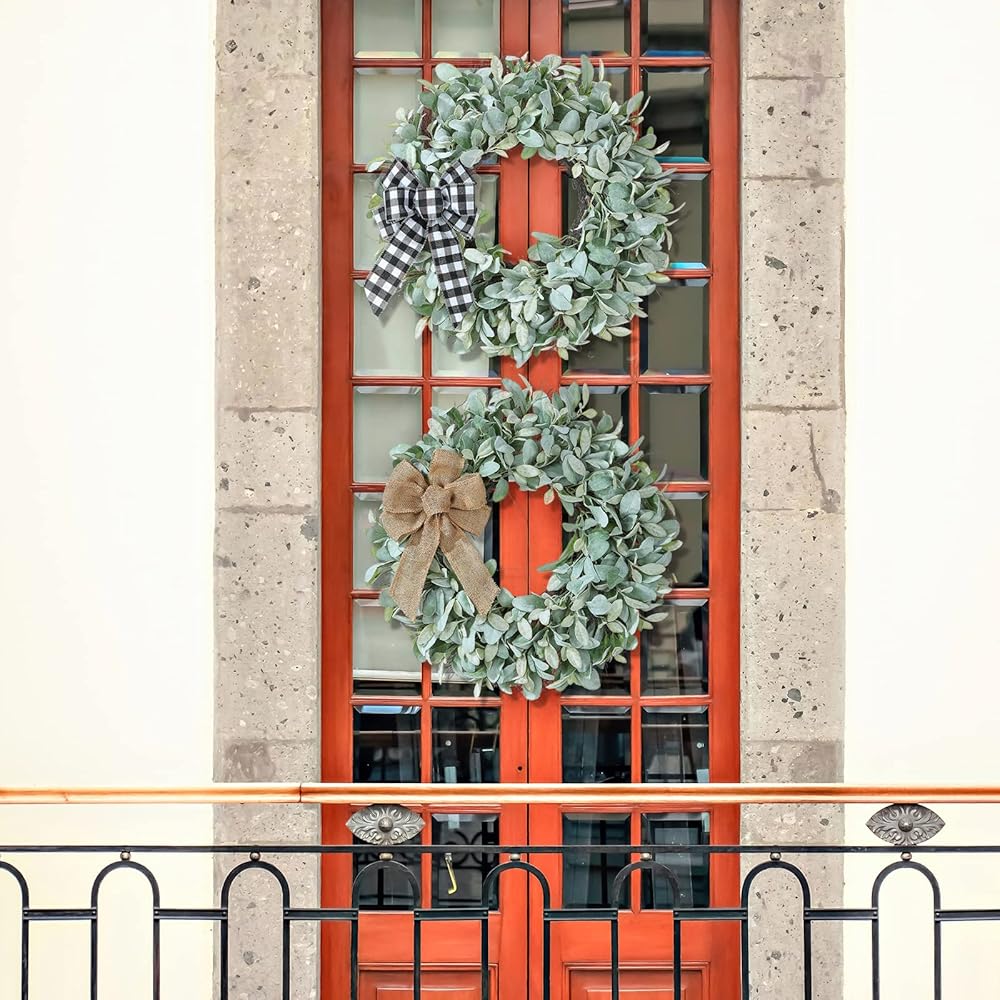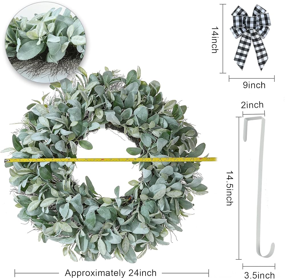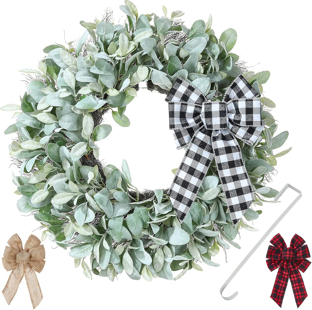 KuiMen 5-piece wreath set contains 1 Artificial  Flocked Lambs Ear Leaf wreath(24inch), 3 bows (1 burlap bow, 1 red/black checked cloth bow, 1 black/white checked cloth bow) 1 front door Wreath hanger