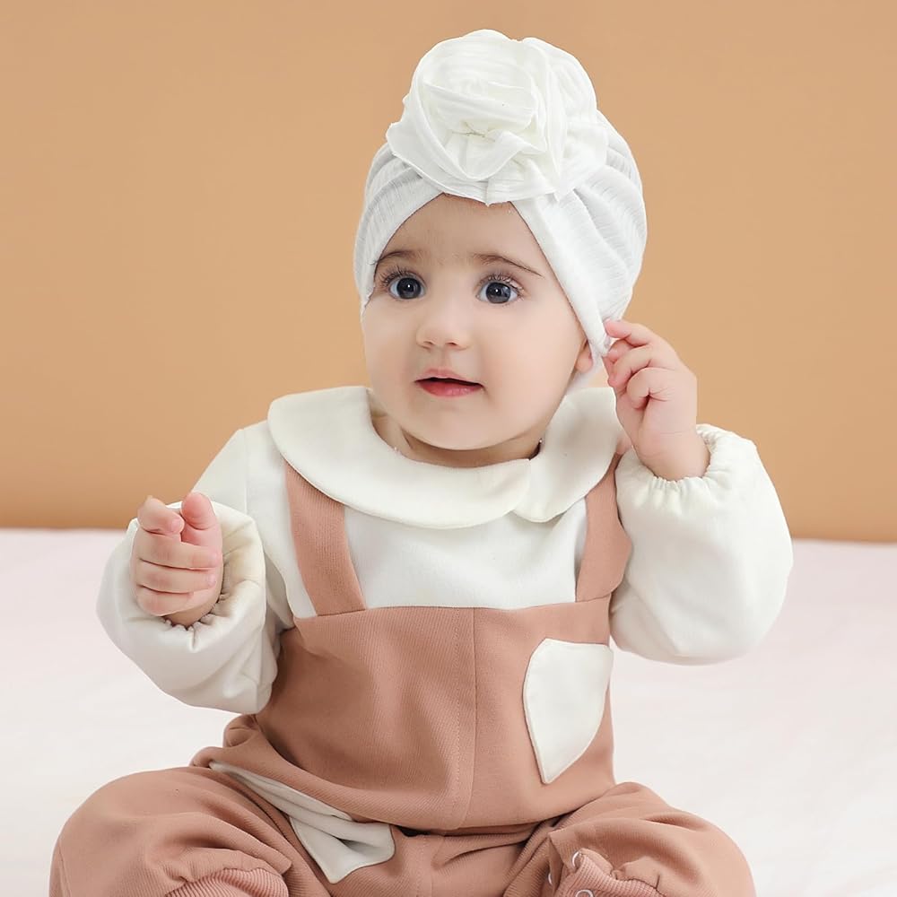 Cinaci 8 Pack Solid Nursery Hospital Turban Hats with Flower Floral Caps Beanies Bonnets for Baby Girls Toddlers Infants, White, Pink, Dirty Pink, Burgundy, Mustard, Blue, Gray and Black, 3-24 Months