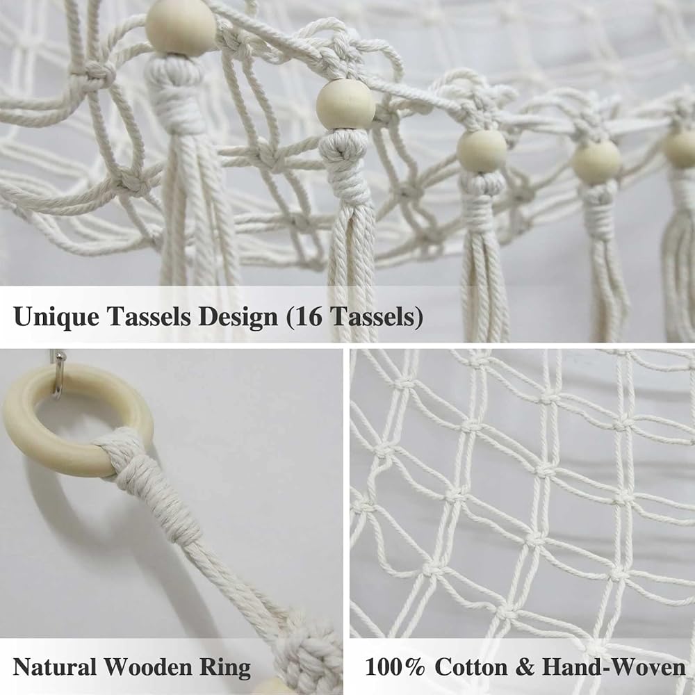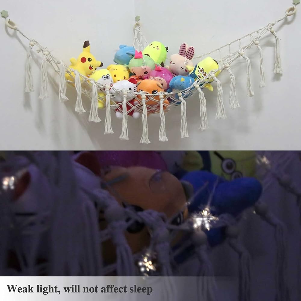 【Bohemian Style】Romantic bohemian style, handmade lace rope, decorated with 16 tassels, and snowflake LED light. The toy net hammock for stuffed animals is not just an organizer, it's the perfect decoration.
