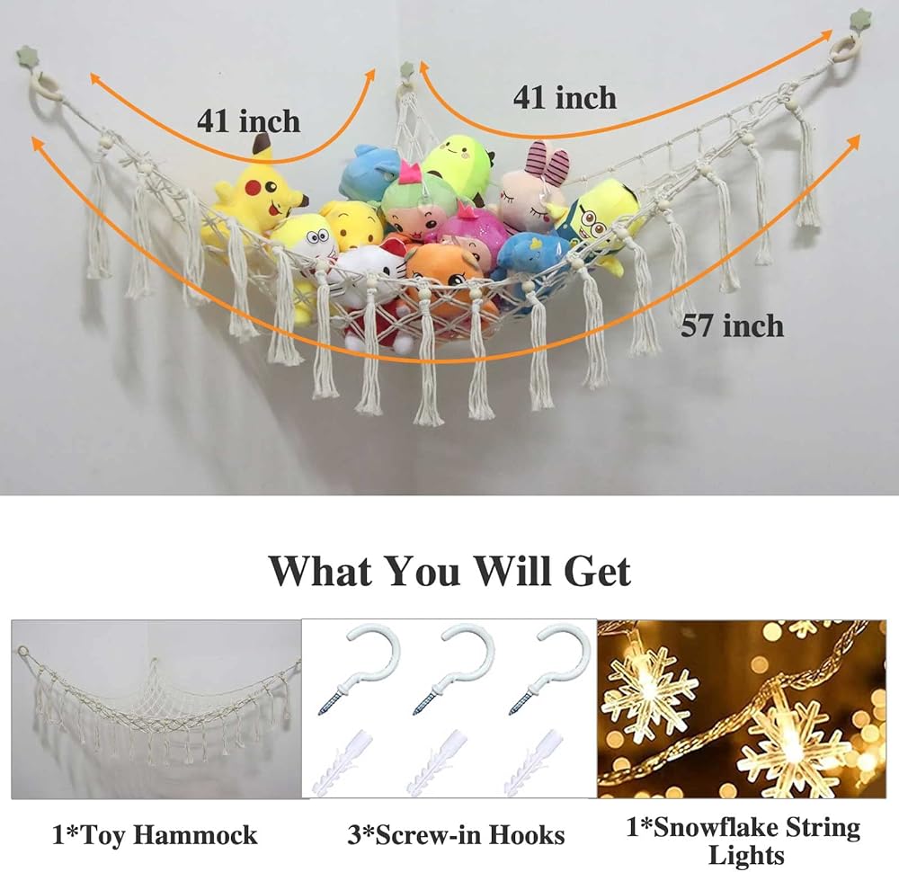 【Animal Hammock Set】you will receive a large toy hammocks, a 5 feet long LED snowflakes lights and 6 pieces of screws and wood hooks. It is an interesting way to display animals and also exercise children's organize skills. NOT including batteries, PLEASE prepare 2pcs AA batteries yourself.