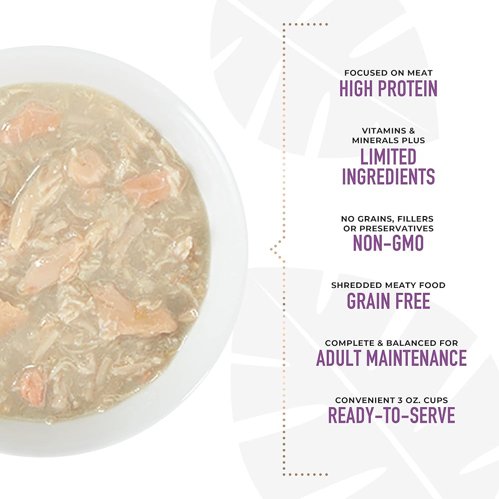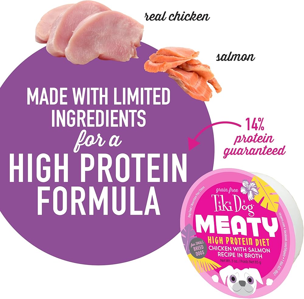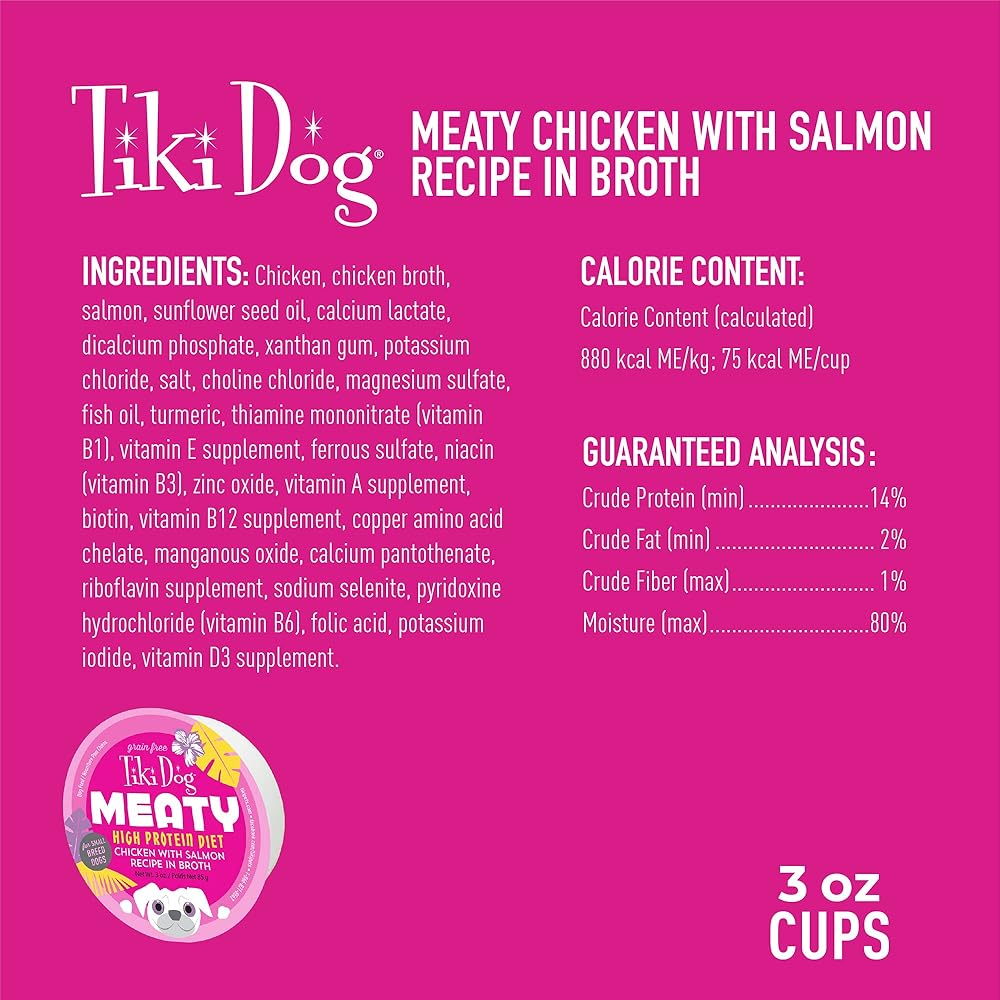 Tiki Dog Meaty Recipes in Broth canned dog food focuses on protein. You won't find any grain or added carbohydrates in these shredded meat cups. This grain free wet dog food contains shredded meat recipes that are packed in a natural broth for additional moisture and flavor. Feed your best friend delicious salmon.