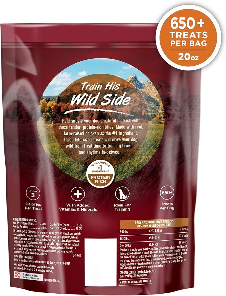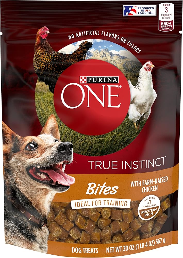 Surprise your dog with Purina ONE True Instinct Bites With Farm-Raised Chicken dog treats to reward him for being a good boy. Bite-sized pieces of delicious goodness await him at snack time. These tender, protein-rich treats feature real farm-raised chicken as the #1 ingredient, along with other high-quality ingredients. Each dog treat contains less than 3 calories per bite, so go ahead and indulge his wild side at snack time. Your adult dog gets the taste he loves in a guilt-free snack made with no artificial flavors or colors. You can feel good serving these delicious treats because each serving contains added vitamins and minerals. We produce these dog treats in U.S. facilities for added peace of mind. Make these dog treats a part of his obedience training sessions, or serve them between meals as a delectable snack that appeals to his natural instinct. With more than 650 bites per bag, it's easy to keep your pantry stocked with treats to make your dog's day a little more special.