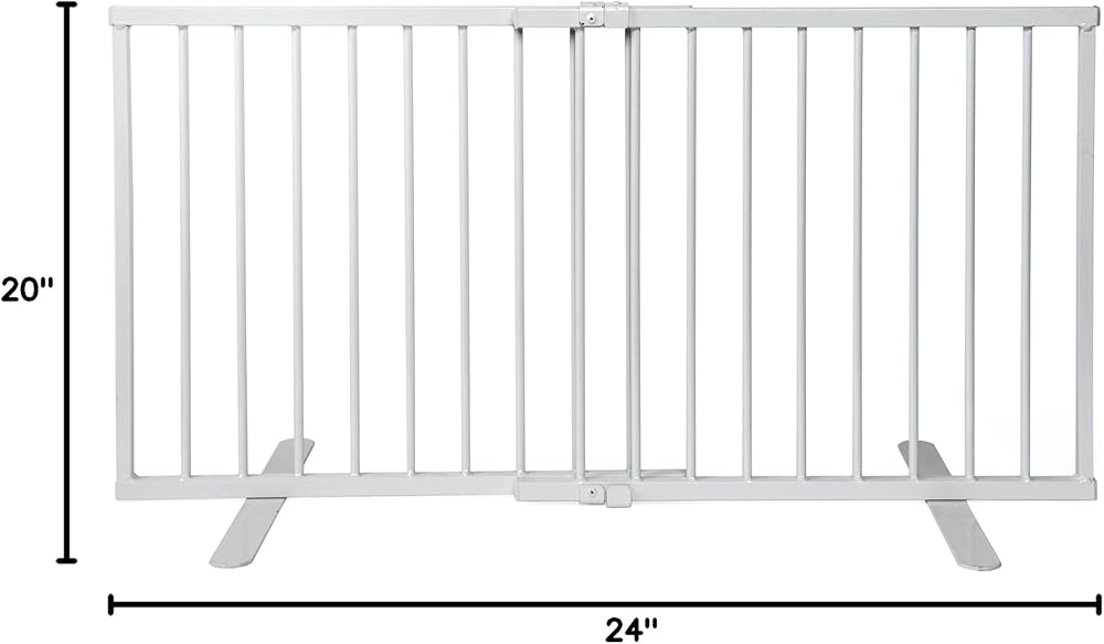 A free-standing barrier to keep small dogs or non-jumpers from going places you don't want them to go. No holes in the wall are needed with this gate. All metal construction is impossible to chew up and heavy enough (9 Lbs.) so it can't be pushed out of the way. This gate will last many years and look great in any home. Height is 20” and the gate can be extended from a minimum of 24” up to 41” which accommodates most doorways. Great for containing small and toy size pets with only 2-inches of space between the bars. Two fixed feet, 14.25" long, attach to support and give stability. Available colors are black and white.