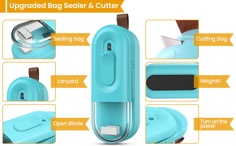 • 【سهلة الاستخدام】كيفية إغلاق الأكياس؟ 1. ادفع المفتاح مرة أخرى للعمل. 2. اضغط على الغطاء العلوي، وقم بتثبيت الجيب، واستمر في السحب ببطء بمعدل متساوٍ. كيفية فتح الحقائب؟1. ادفع مفتاح سكين الإغلاق لأعلى ولا تفكه. 2. حرك السكين للخارج للقطع.