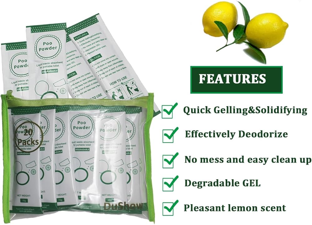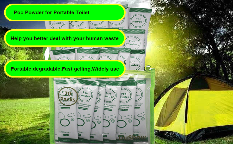 مسحوق براز سريع الامتصاص: يمكن استخدام مسحوق براز المرحاض المحمول للتخلص السريع من النفايات السائلة خلال 2-3 دقائق. لا يوجد انسكابات أو تسربات أو تناثر أو تلوث أغراضك. تحتوي قوة براز المرحاض للتخييم على 20 عبوة في كيس، تحتوي كل عبوة على 15 جرام تعالج 0.5 إلى 0.76 جالون من النفايات السائلة في كل عبوة.