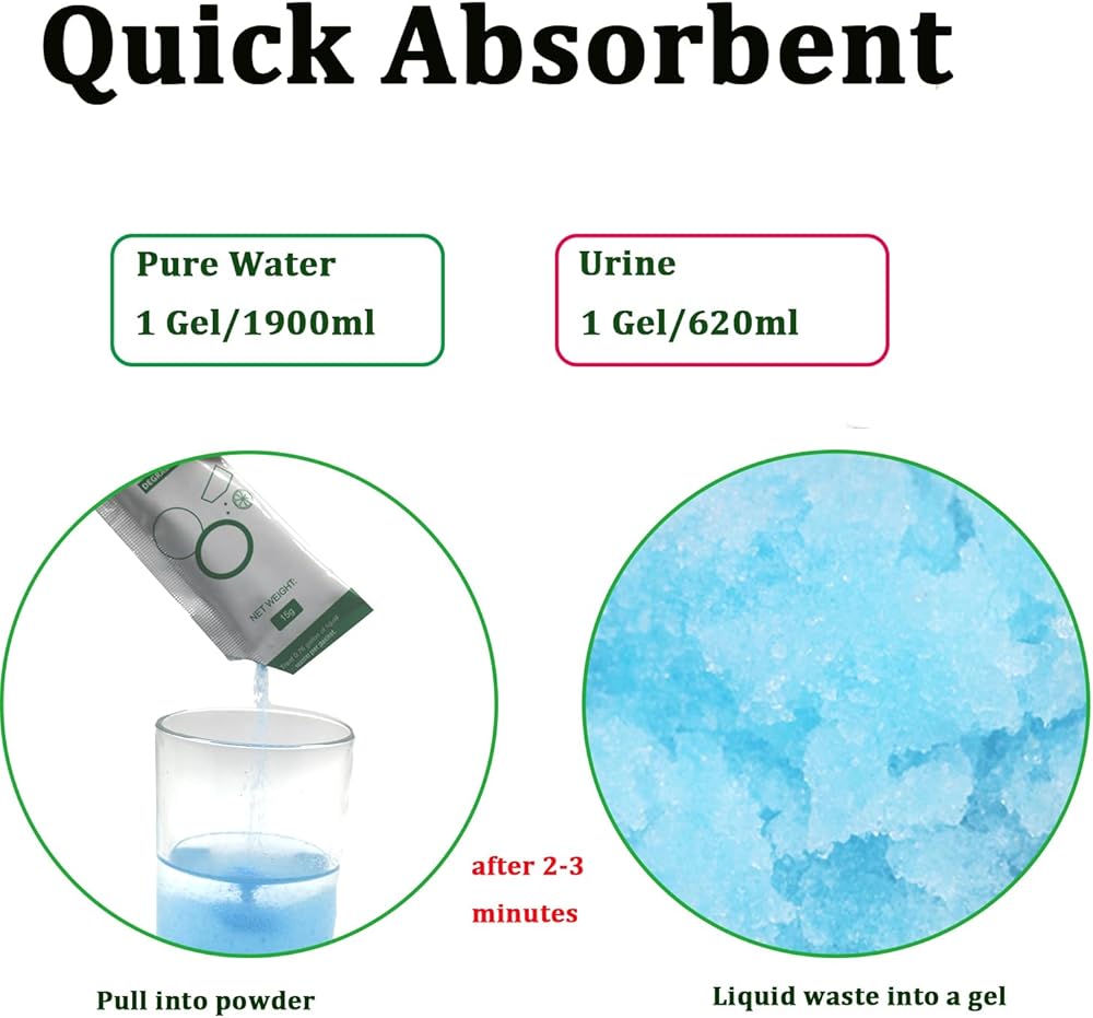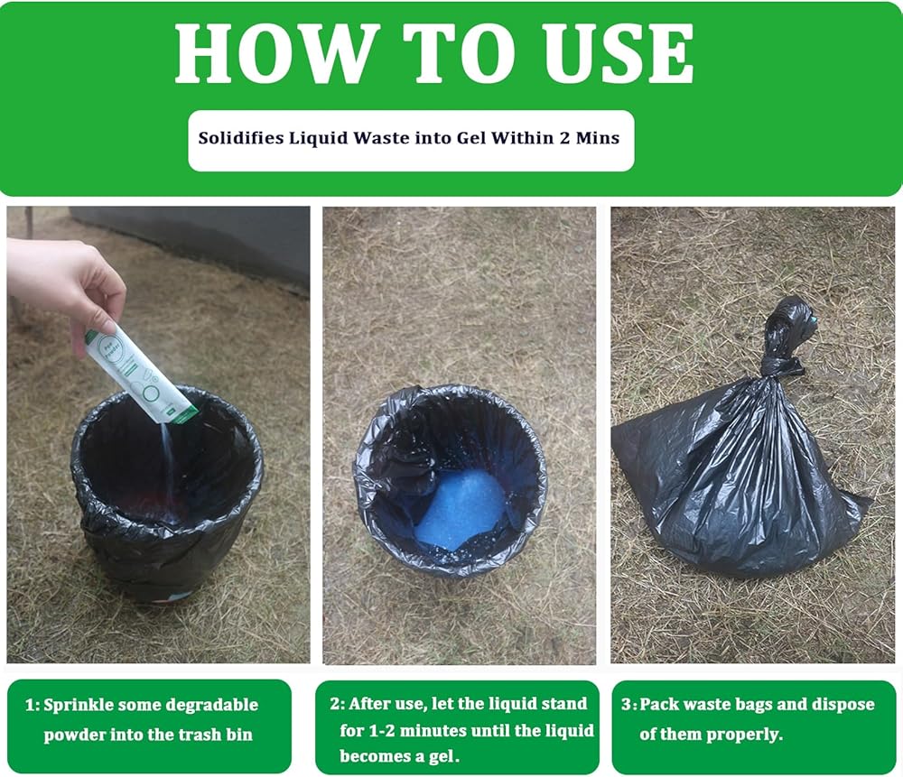 سهل الاستخدام: ما عليك سوى فتح العبوة ثم رش الحبيبات في النفايات السائلة وانتظر من 1 إلى 3 دقائق. يتم امتصاص مسحوق براز المرحاض للتخييم بسرعة بواسطة الجزيئات ويصبح جلًا على الفور
