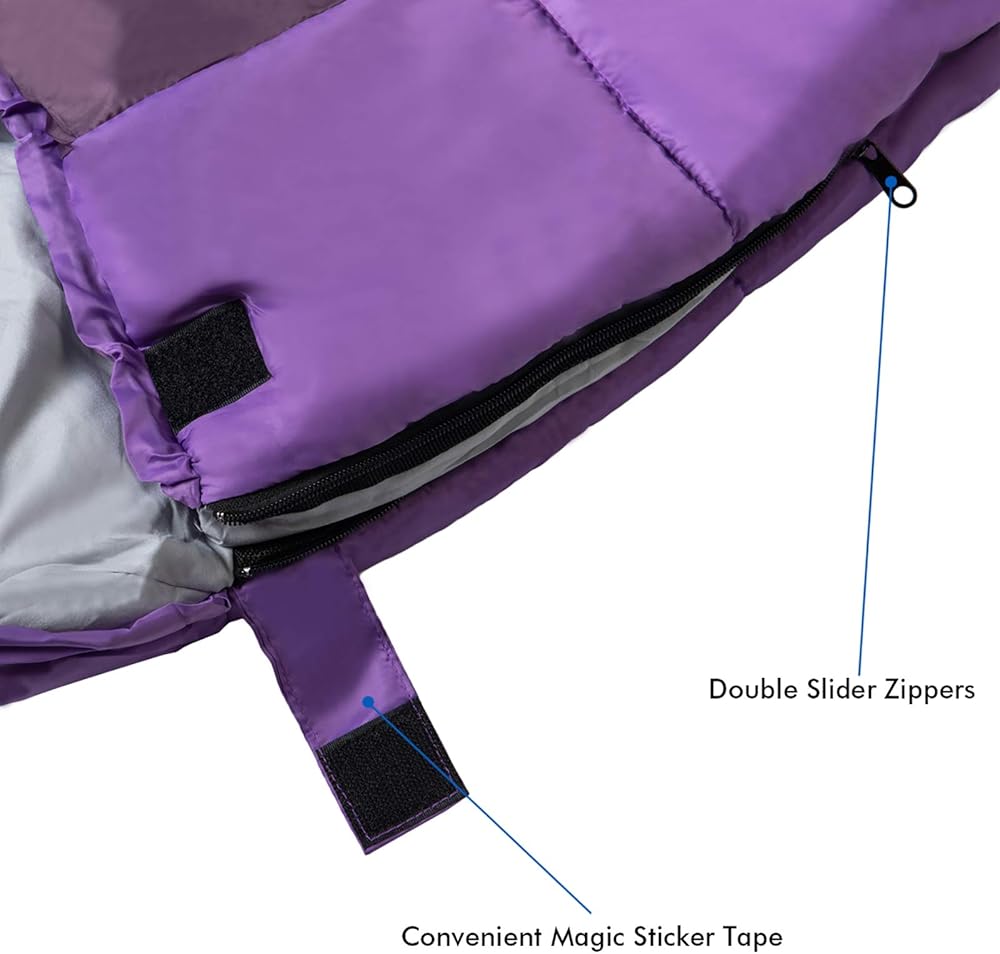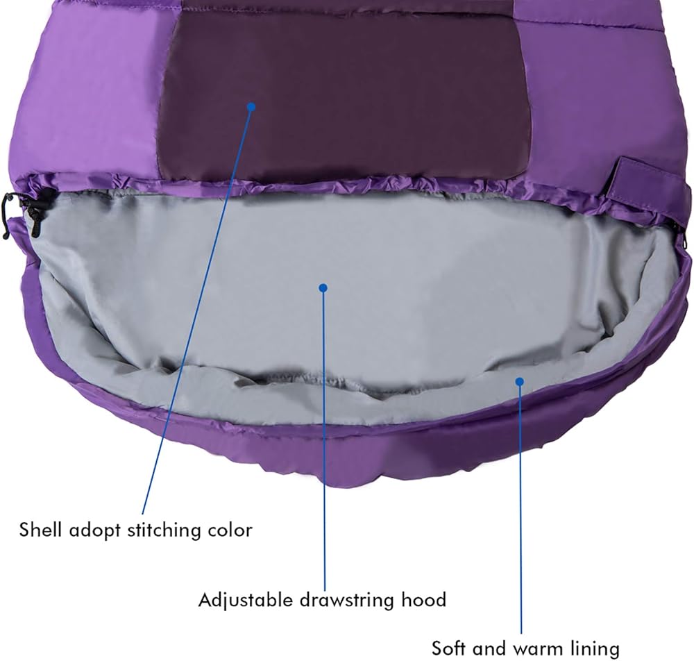 Comfort Design: The camping sleeping bag adopts a skin-friendly lining. A mummy shape gives the child the freedom to move. The 3D design makes feet stretch when the child finishes a daytime play. Smooth zipper and velcro keeps child easy access