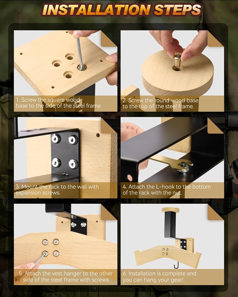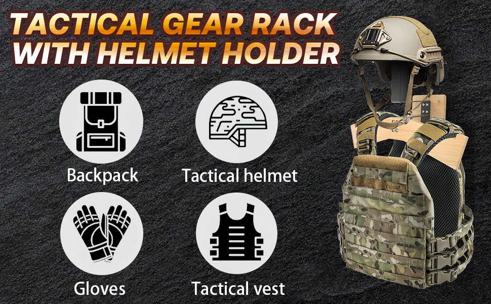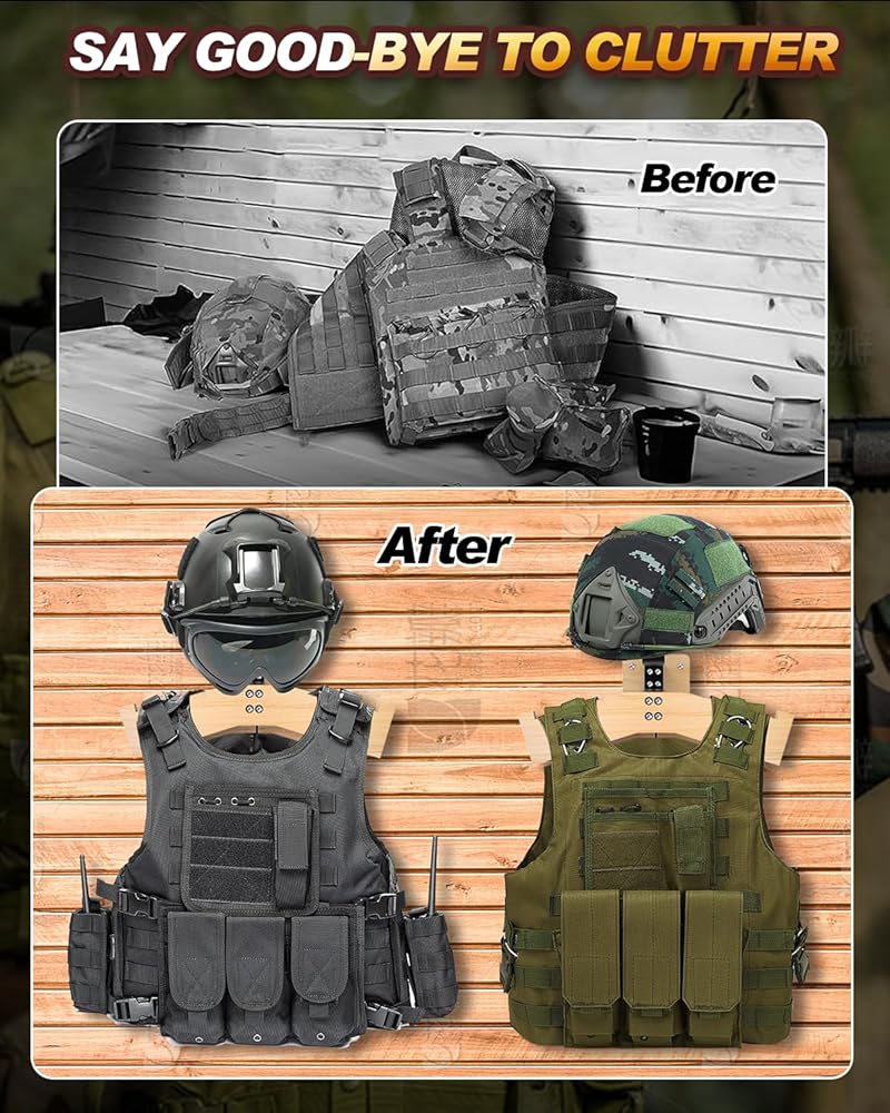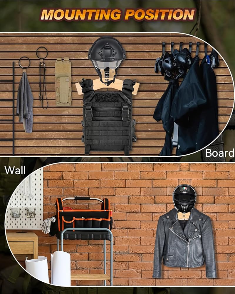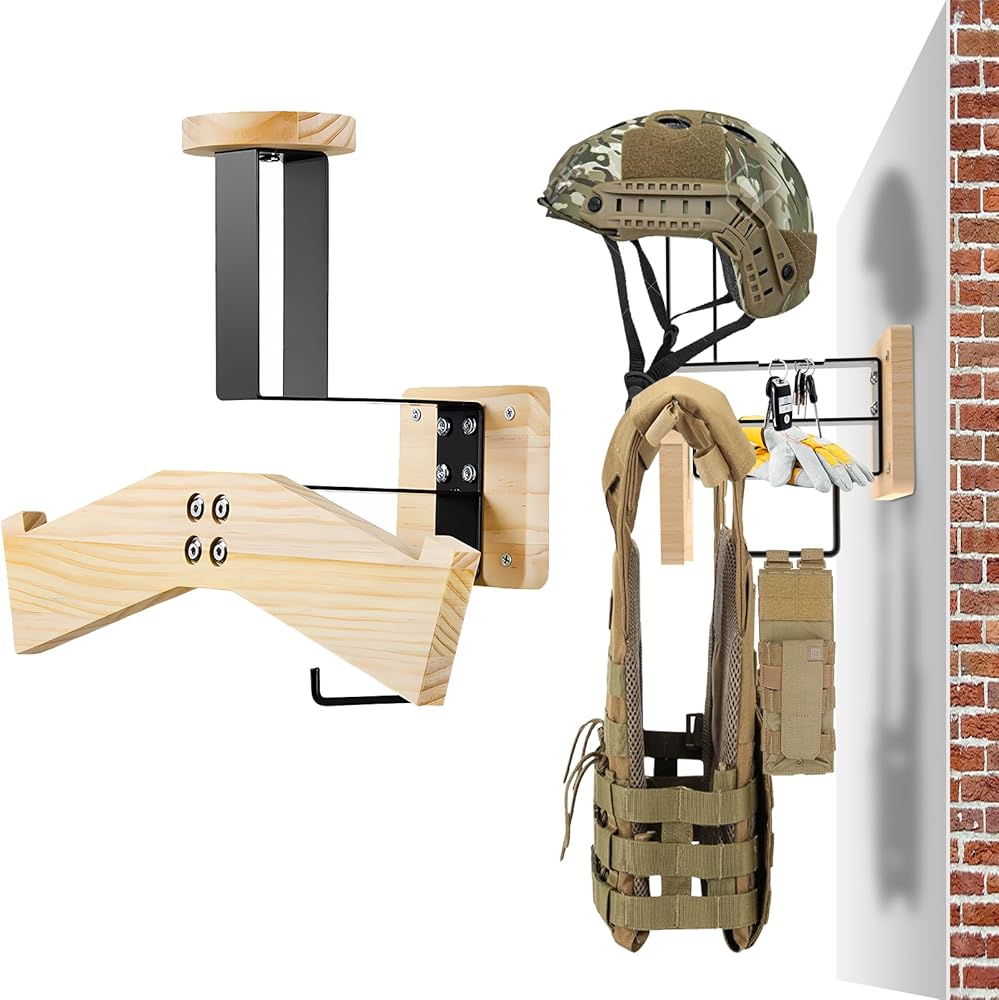 سترة تكتيكية مدمجة وحامل خوذة مصنوع من مزيج من خشب الزان والحديد. مثالية لتخزين معداتك التكتيكية على الحائط، أو تركيب معداتك وملابسك للأنشطة المختلفة، مثل ركوب الدراجة النارية أو ركوب الدراجات أو التزلج أو لعب كرة القدم.