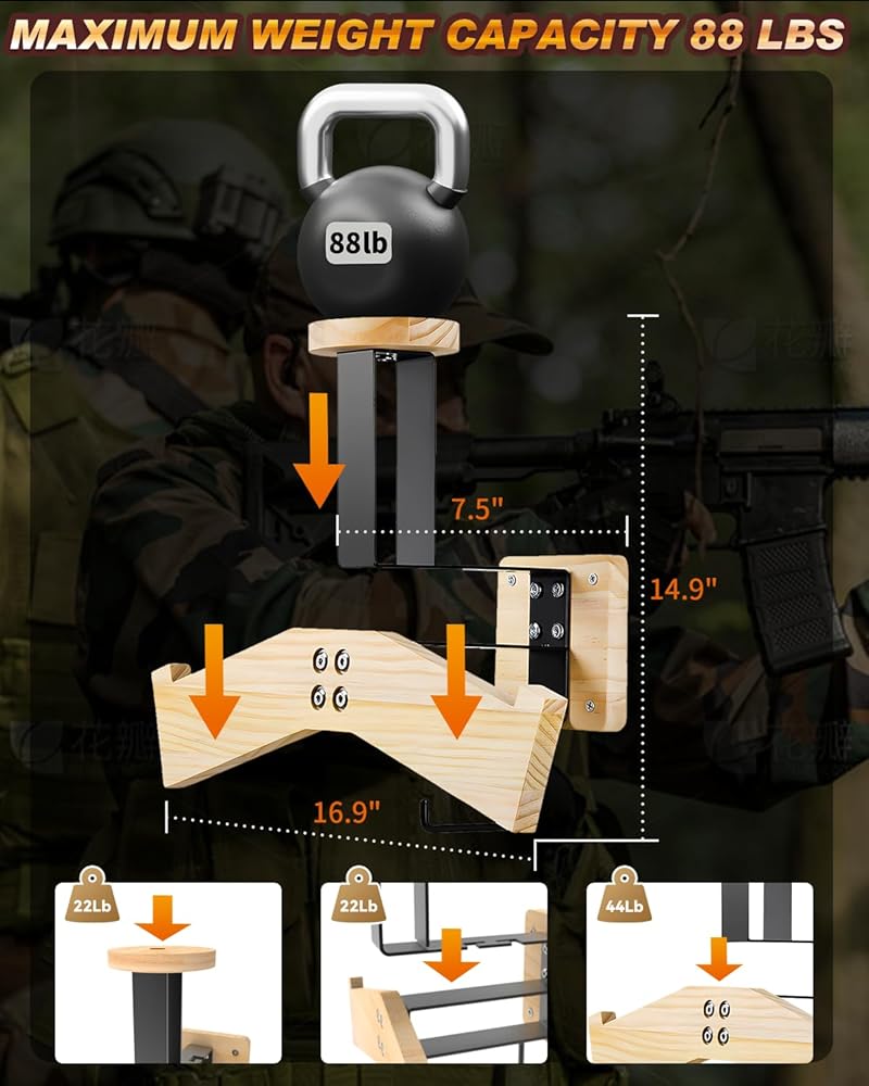 سعة تحميل شديدة التحمل - يمكن لحامل الحائط التكتيكي حمل ما يصل إلى 88 باوند. تتميز بسعة رف خوذة تصل إلى 22 باوند، وسعة رف السترات 44 باوند، وسعة رف الحزام 22 باوند، مما يضمن أن معداتك آمنة ومحكمة. كما أنه حل تخزين قوي وموثوق لمعداتك التكتيكية.