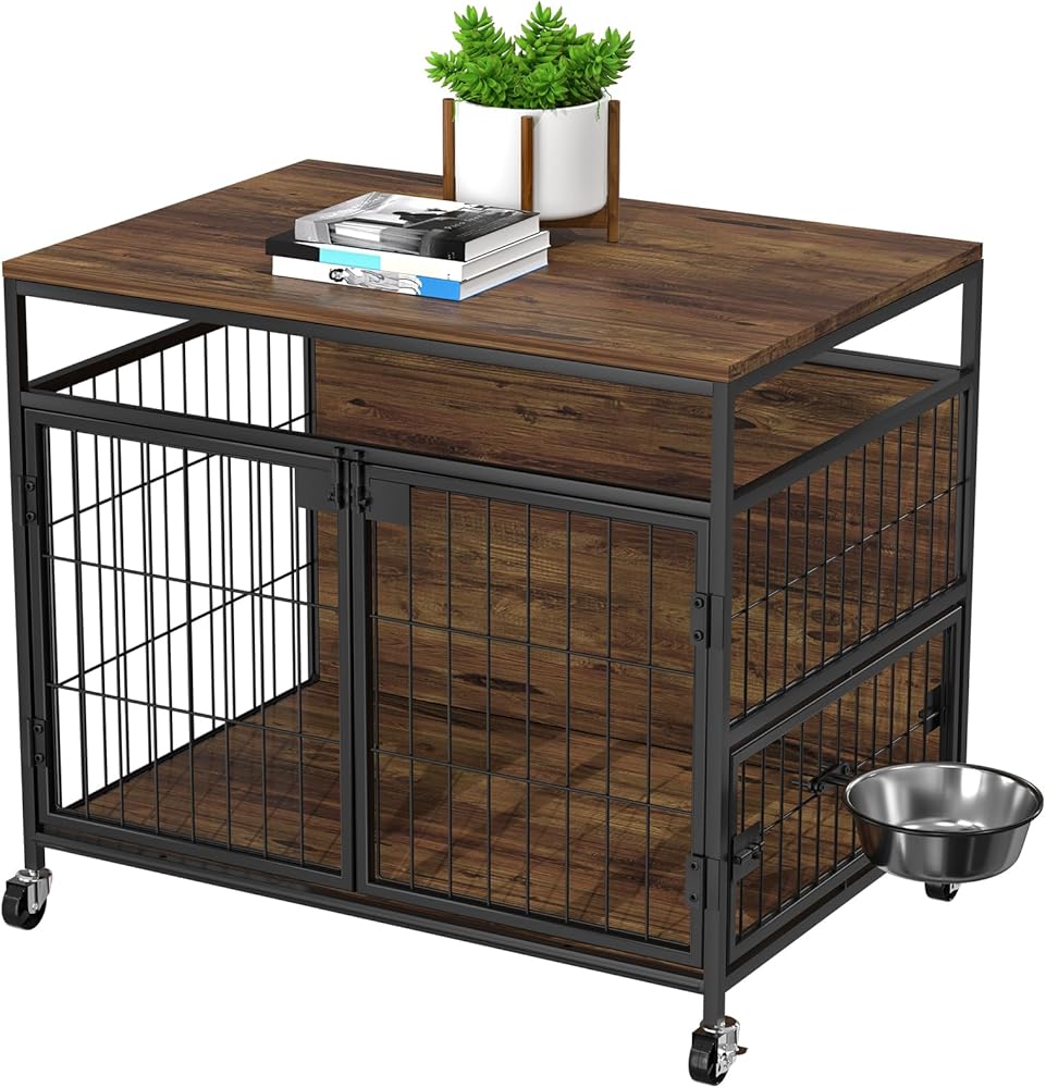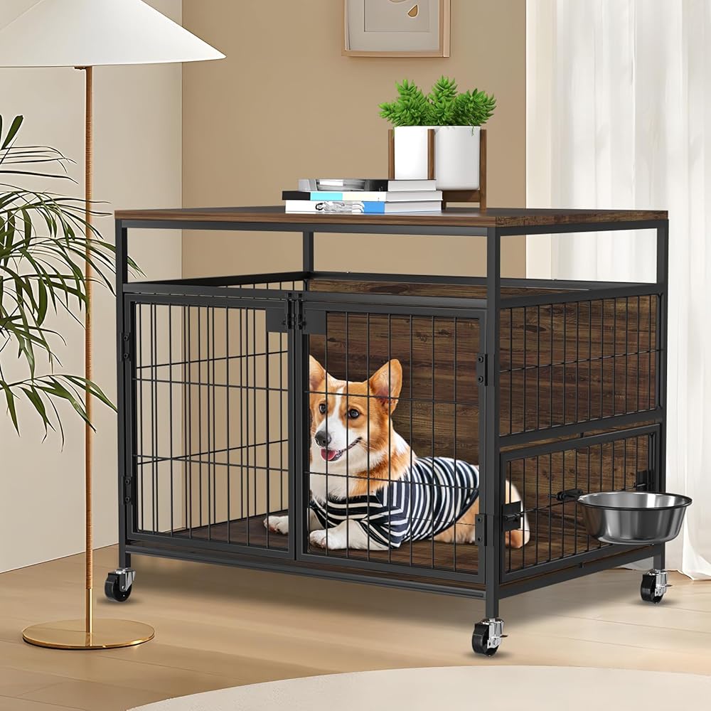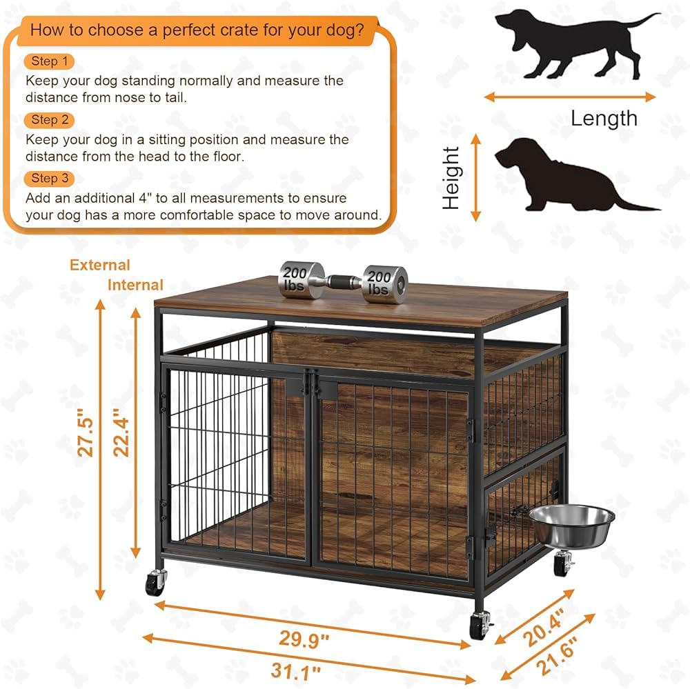 أثاث قفص الكلاب للكلاب الكبيرة ، بيت الكلب الخشبي مع الأبواب المزدوجة ، قفص الكلب الطاولة الشاق للكلاب ، عجلات دوارة أو منصات القدم (39.4 "L x 28.3" W × 31.7 "H)