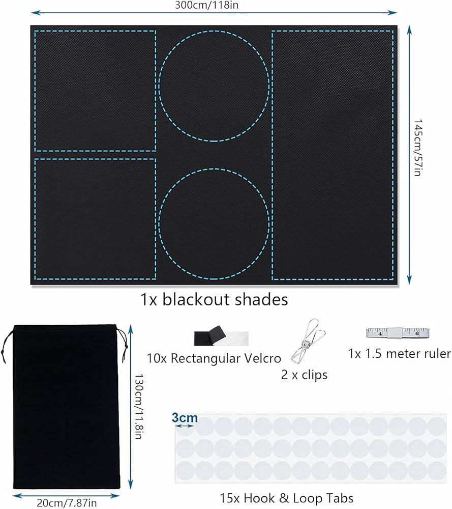 【Package Include】You can get a 300x145cm(118“ x57”)blackout shades, 1 x ruler, 15 pairs x Hook & Loop Tabs, 10 pairs x Rectangular Velcro, 2 x Stainless steel clips and 1 x Storage bag.