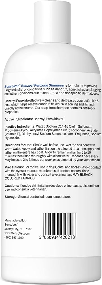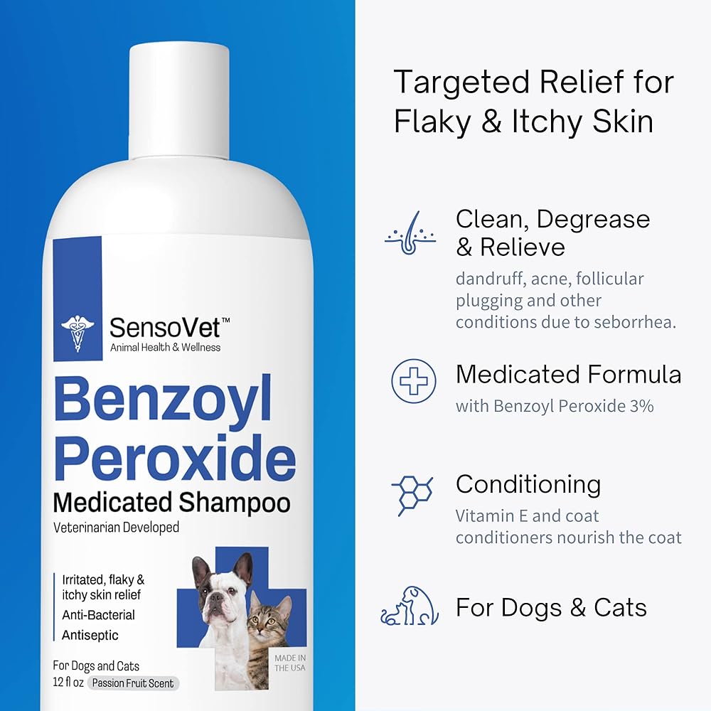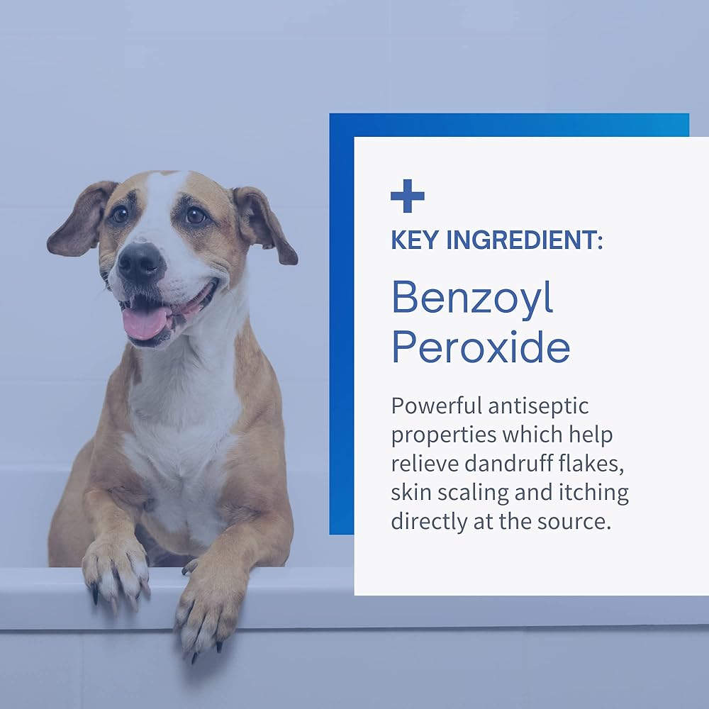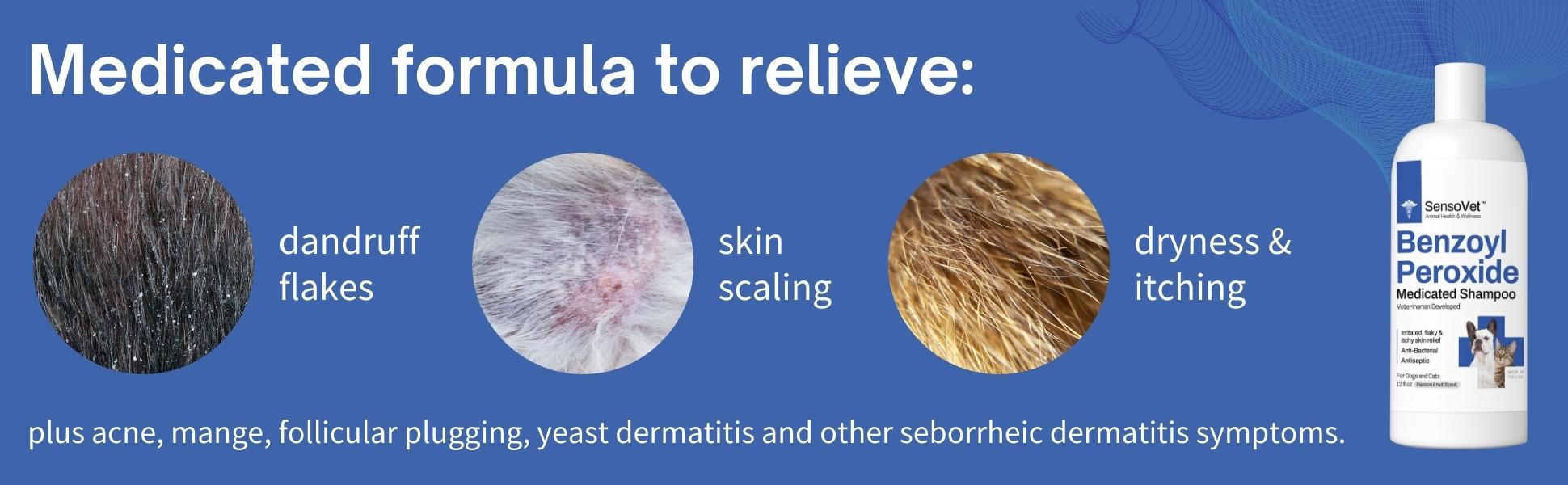 Powerful Medicated Shampoo - Formulated with benzoyl peroxide, an antiseptic with antibacterial properties — an effective treatment for dandruff, dog and cat chin acne, seborrheic dermatitis, mange, follicular plugging, yeast dermatitis and nonspecific dermatoses.
