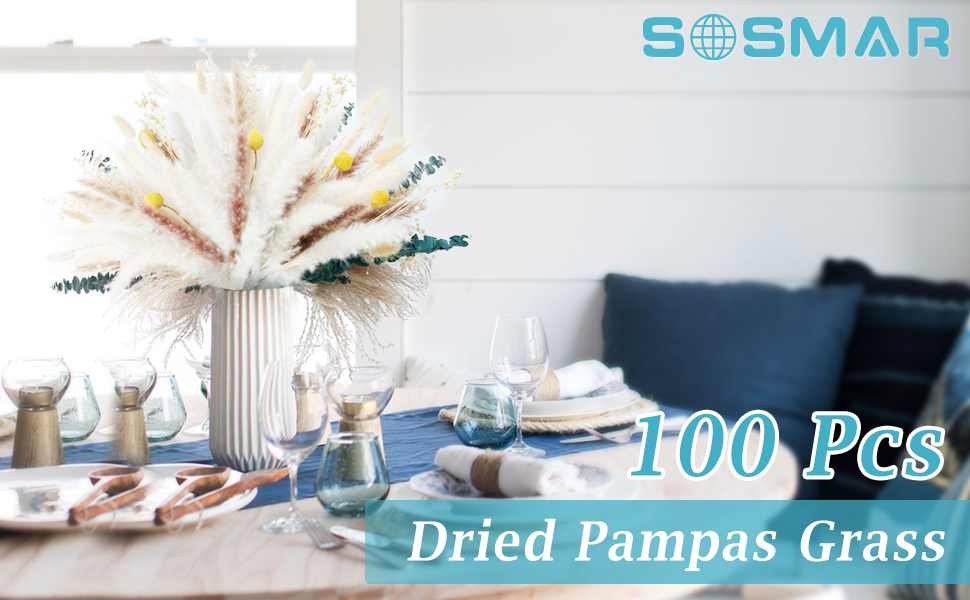SOSMAR Pampas Grass، 100 قطعة من زهور النباتات الطبيعية المجففة، نبات عشب Pampas، ترتيب زهور بوهو، زهور مجففة رقيق لديكور مزرعة الربيع، ديكور طاولة الزهور، ديكور زفاف طبيعي