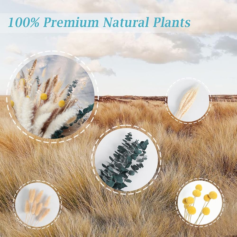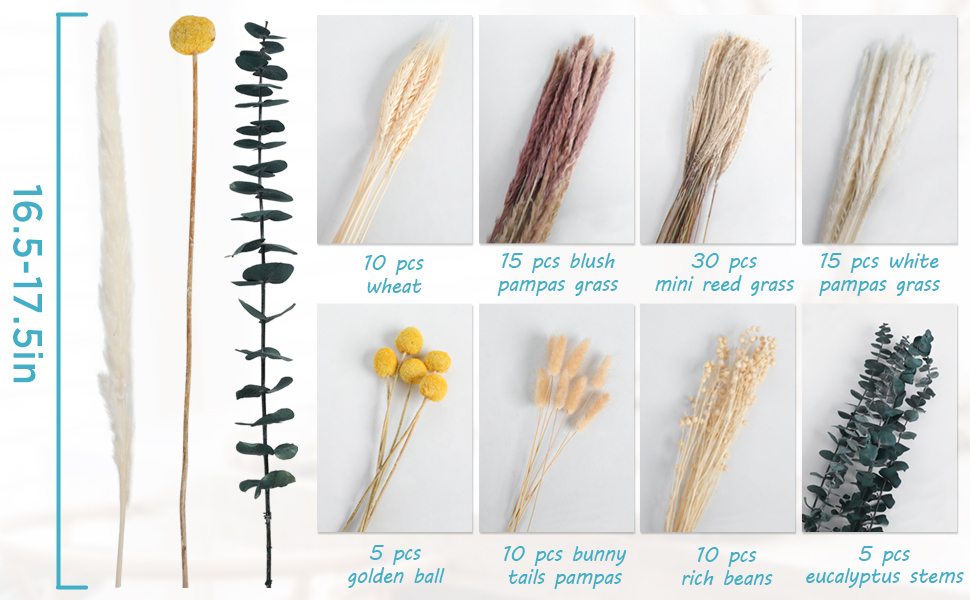 8 أنماط من الزهور المجففة: إجمالي عدد 100 قطعة، الطول 17 بوصة، تحتوي على 8 أنواع من العشب: 30 قطعة من عشب القصب الصغير، 15 قطعة من عشب بامباس أحمر الخدود، 15 قطعة عشب بامباس الأبيض، 10 قطع قمح، 10 قطع بامباس ذيول أرنب ، 5 قطع كرة ذهبية، 5 قطع سيقان أوكالبتوس، 10 قطع فاصوليا غنية.