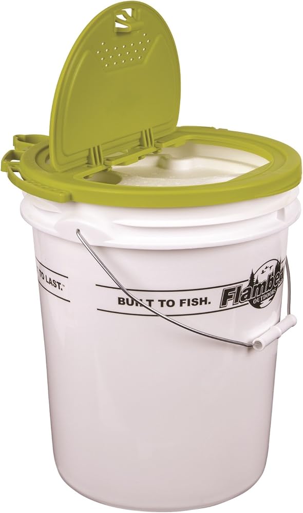 EASY-ACCESS VENTED LID: Features Flambeau's Premium Bait Bucket Lid (#6062BC) with accessory rails for holding a fishing rod, attaching aerators, hanging hooks, etc. The easy-to-open vented lid keeps your live bait oxygenated and fresh.