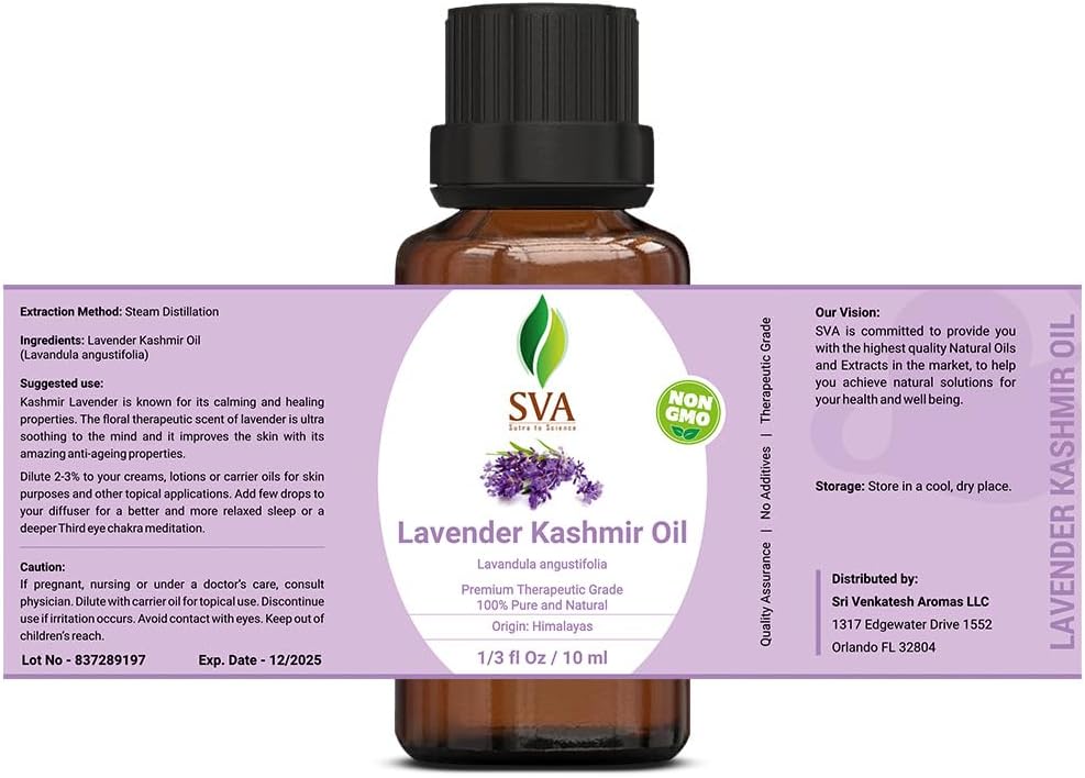 زيت لافندر فاخر بدرجة علاجية: - يتم الحصول على زيت اللافندر كشمير العطري من إس في إيه أورجانيكس عن طريق التقطير بالبخار من زهور لافاندولا أنغوستيفوليا التي تعود أصلها هيمياس. إنه نقي وطبيعي بنسبة 100%، وأصلي وخالي تمامًا من الكحول والمذيبات. زيت اللافندر كشميري الخاص بنا ليس على الحيوانات. نحن نهتم بك!
