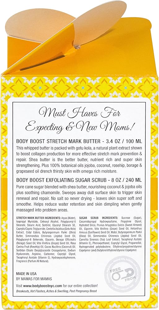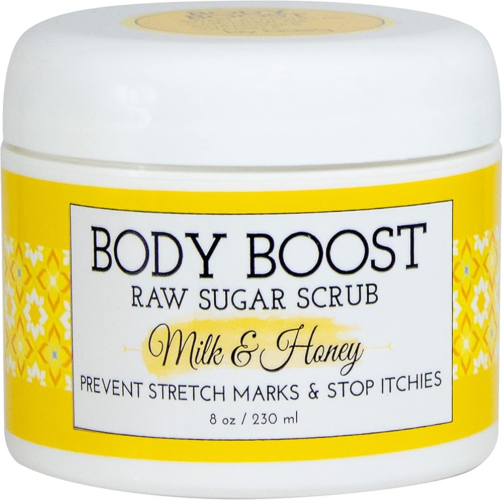Must Have Skin Care for Expecting and New Mamas! Our whipped Stretch Mark Butter is packed with gotu kola, a natural plant extract shown to boost collagen production for more effective stretch mark prevention and repair. Shea butter is the better butter, nutrient rich and super skin strengthening. Plus 100% natural botanical oils jojoba, coconut, rosehip, borage, and grapeseed oil drench dry skin with omega rich moisture for protection and repair. Our Skin Smoothing Sugar Scrub is a must for pregnant skin. Pure cane sugar is blended with shea butter, nourishing coconut and jojoba oils plus soothing chamomile, providing instant relief for dry, itchy skin. This gentle scrub sweeps away dull flaky skin and jumpstarts the skin renewal that's a must for stretch mark prevention. No salt means it's never drying - leaves skin super soft and smooth. The all natural Milk & Honey Aroma is addictive!