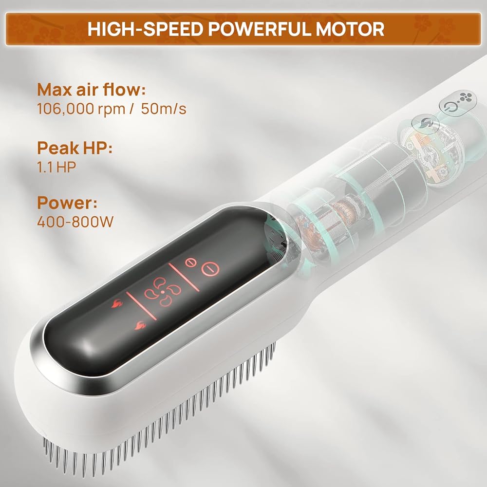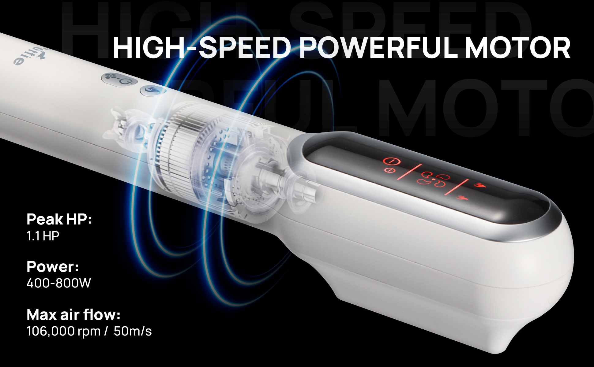 محرك قوي عالي السرعة: يوفر تجربة تجفيف سريعة مرضية. سرعة تدفق الهواء القوية تصل إلى 106,000 دورة في الدقيقة. القوة: 800 واط/ 1.1 حصان. الجهد: 120 فولت~.