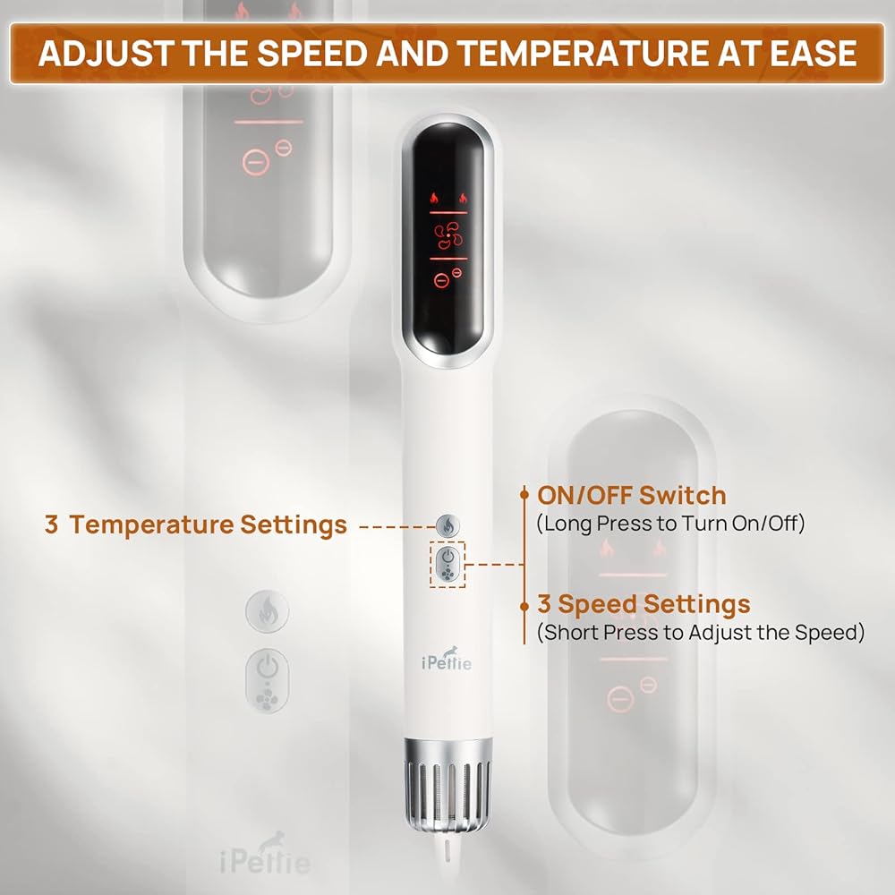 إعدادات الحرارة وتدفق الهواء القابلة للتعديل: 3 درجات حرارة باردة ودافئة (95 درجة فهرنهايت/35 درجة مئوية) وساخنة (158 درجة فهرنهايت/60 درجة مئوية) و3 سرعات رياح (20 م/ث-50 م/ث) مرئية بوضوح على شاشة LCD شاشة العرض، يمكنك رؤية وضع التشغيل الحالي لمجفف الحيوانات الأليفة.
