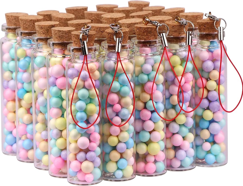 MaxMau Pack of 25,Small Glass Bottles with Cork Filled with Colorful Foam Ball, 20ml Glass Vials Tiny Jars with Twine and Strap for Wedding Party Decoration