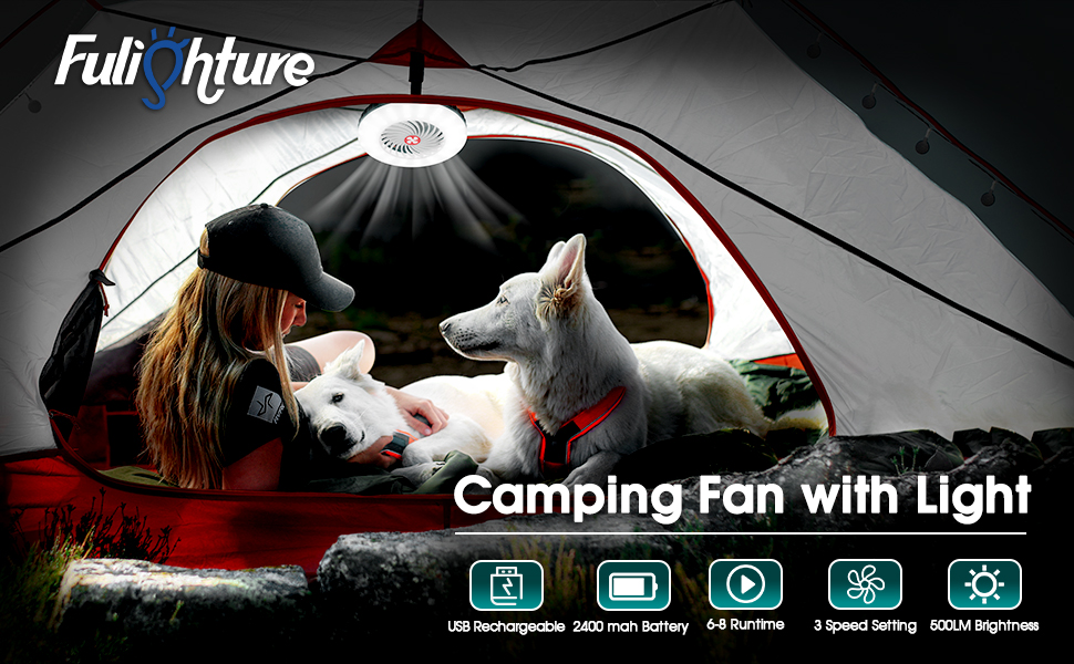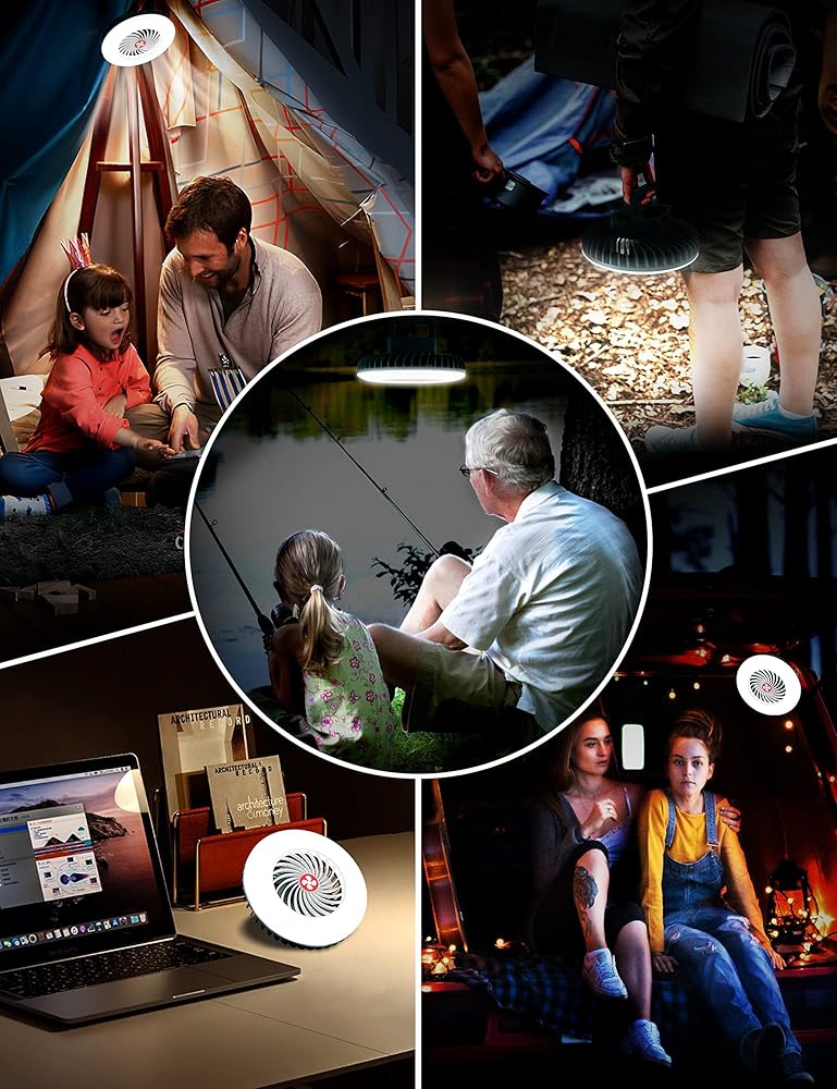 【مروحة تخييم قابلة لإعادة الشحن】إضاءة LED، بطارية 2400 مللي أمبير، شحن كامل 4-5 ساعات، استخدام 6-8 ساعات. شحن الهاتف في حالات الطوارئ. مؤشر الطاقة (25%-100%). مثالية للمغامرات في الهواء الطلق!