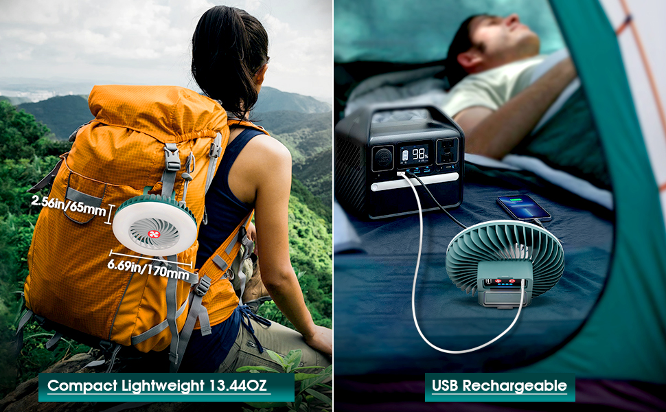 【مروحة محمولة للتخييم 】 مروحة محمولة للتخييم 6.73 × 6.73 × 2.5 بوصة، 9.17 أونصة) توفر المساحة والوزن في حقيبة ظهرك من خلال الجمع بين وظائف المروحة والإضاءة. مثالية للمغامرين أثناء التنقل!