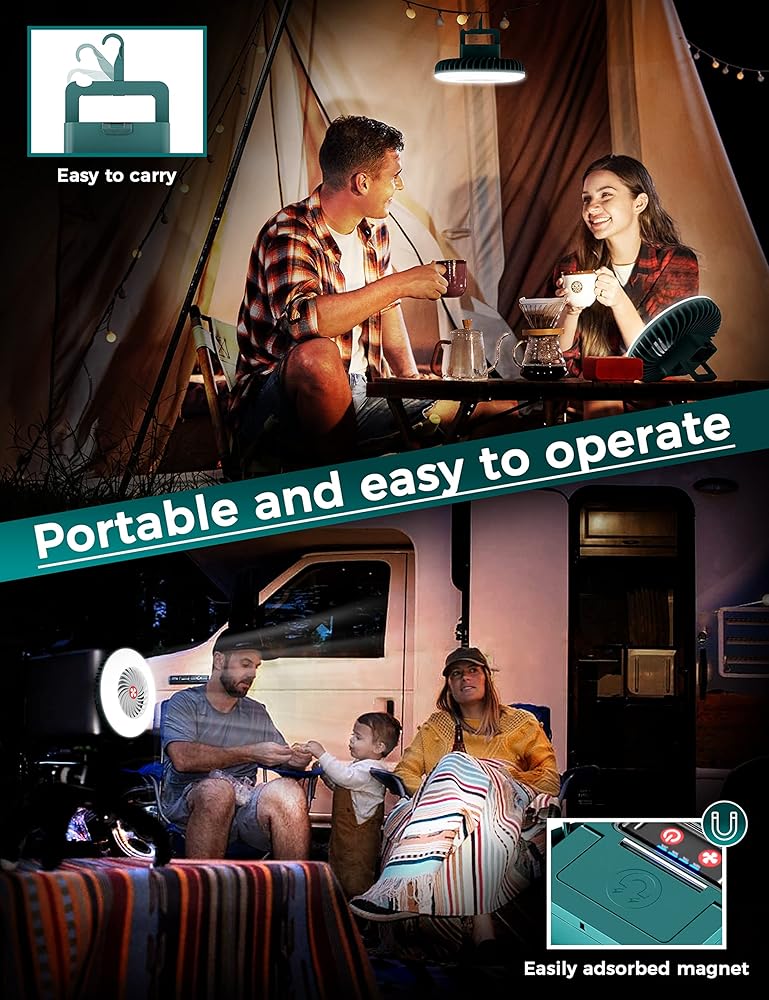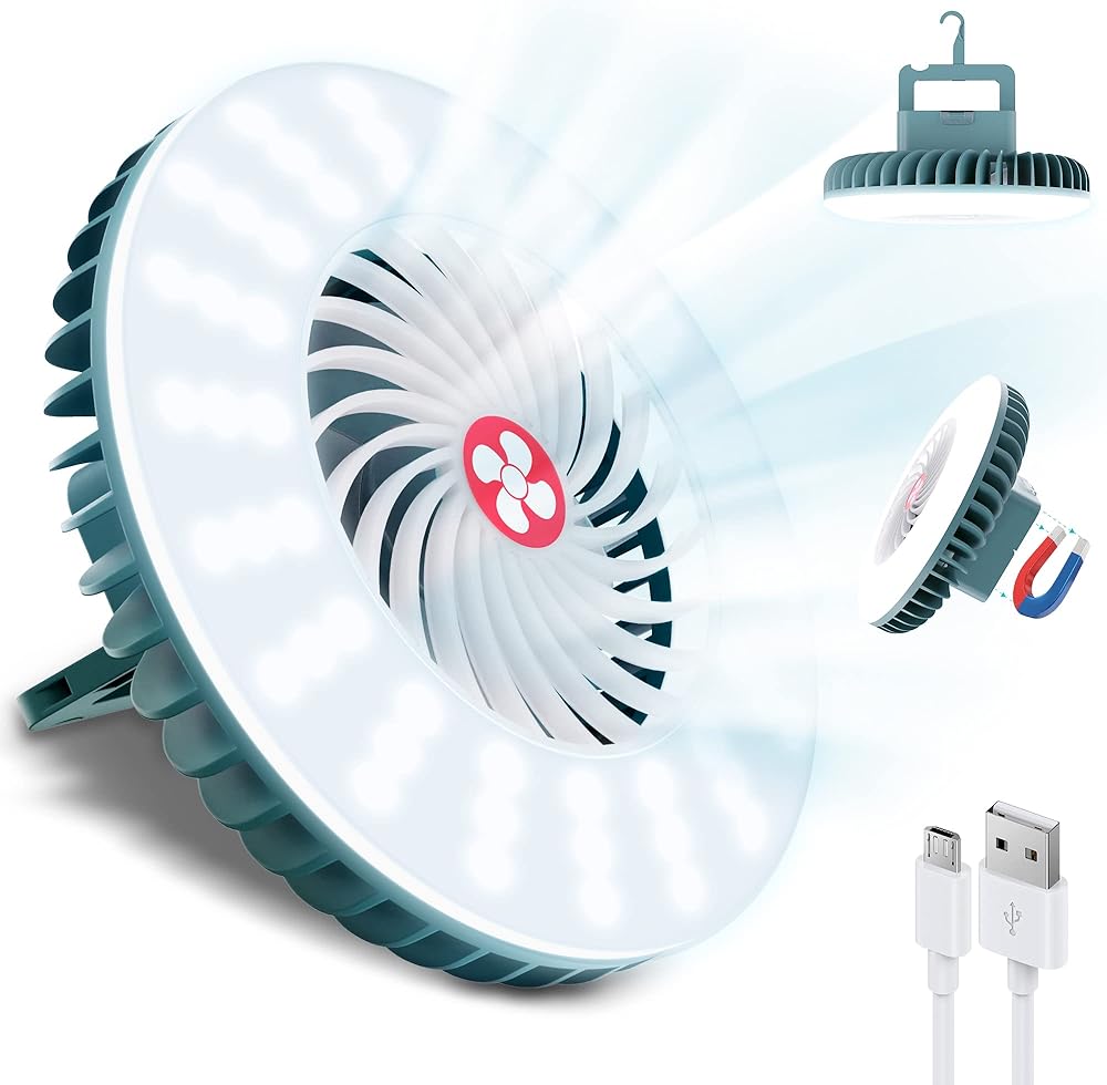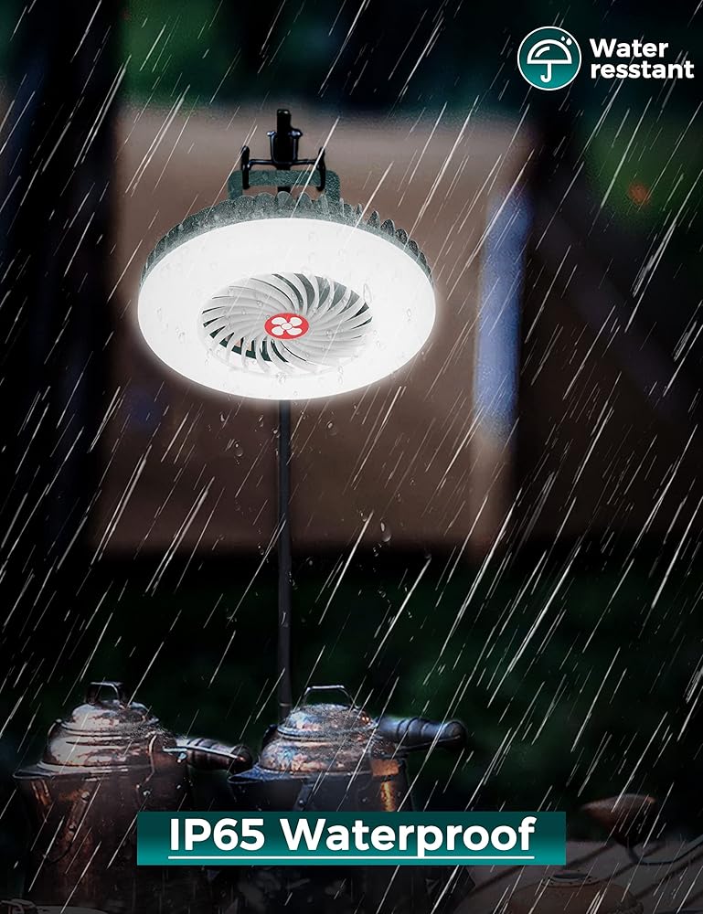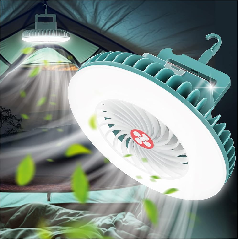 【معدات تخييم احترافية】مروحة خيمة محمولة مزودة بخطاف ومغناطيس لسهولة التعليق على الخيام أو الفروع أو في السيارة. غطاء مقاوم للغبار ومقاوم للماء يضمن أداءً موثوقًا به حتى في الرياح والمطر. مثالية للمغامرات في الهواء الطلق!