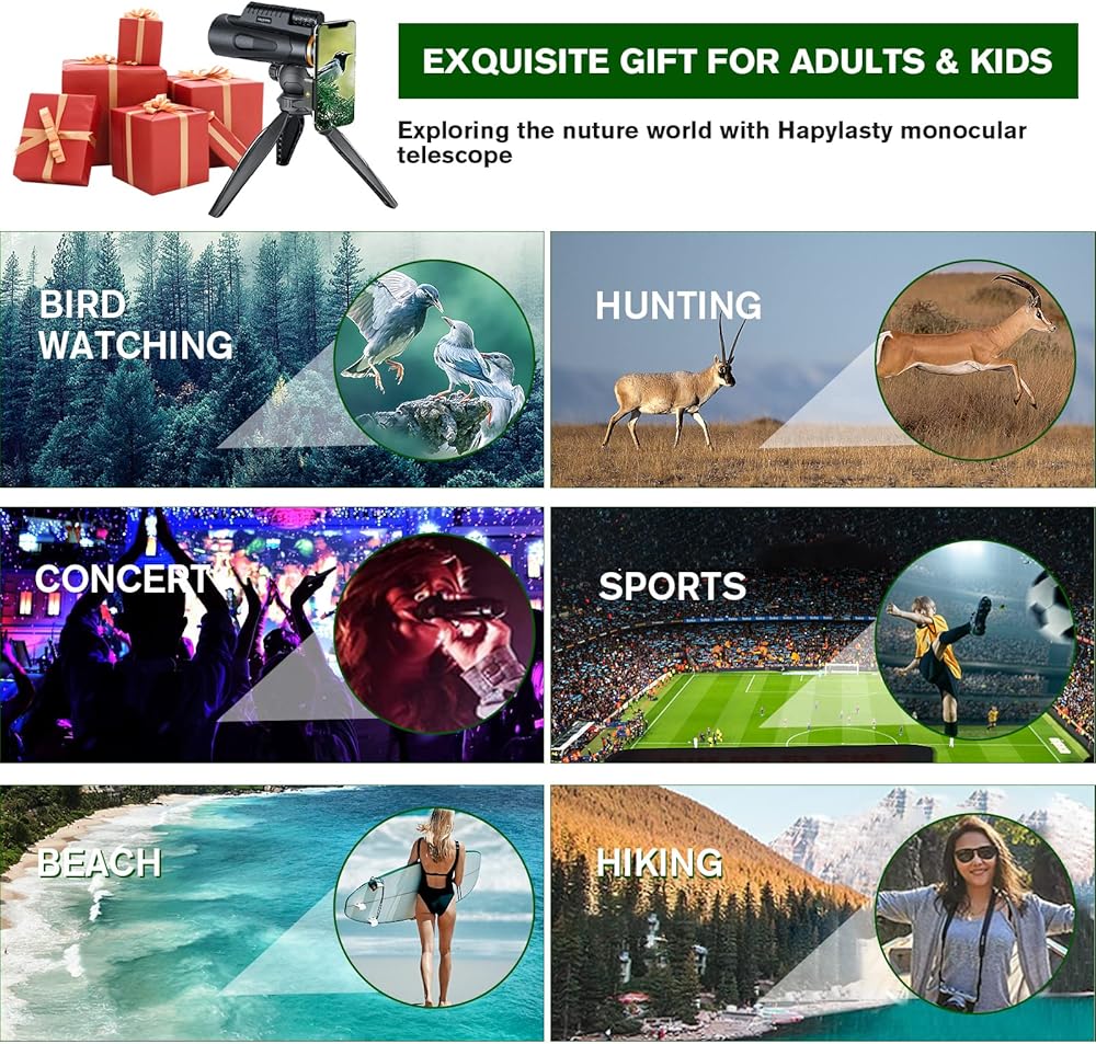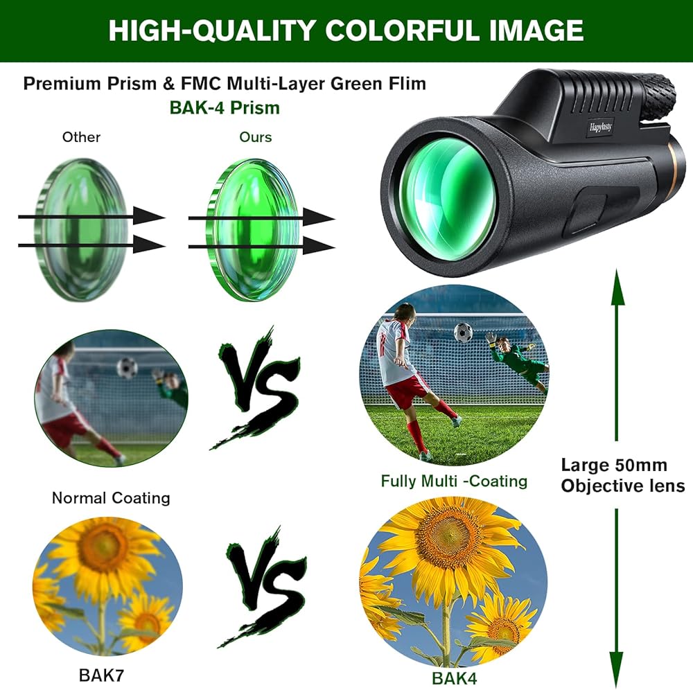دقة أعلى ومنشور BAK-4 - أحدث تقنيات البصريات، منظار أحادي HD للهاتف المحمول مجهز بمنشور BAK-4 وعدسة متعددة الطبقات بالكامل، مما يجعل الصور أكثر وضوحًا ووضوحًا. يتيح لك استخدام عدسة موضوعية أكبر التقاط صور أكثر روعة.