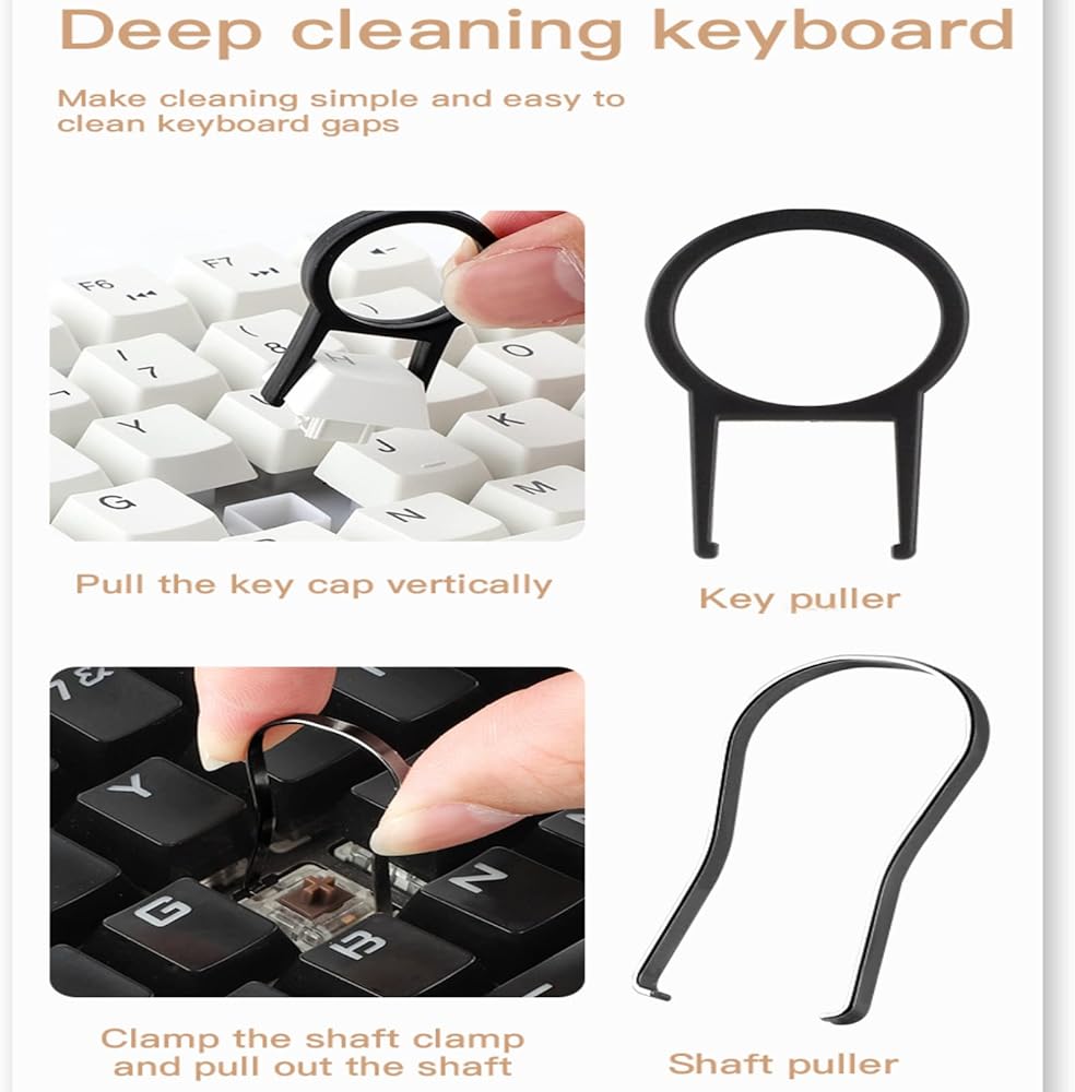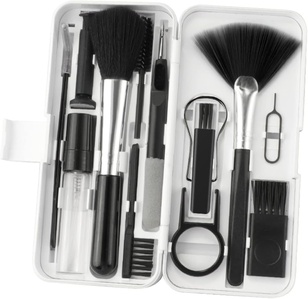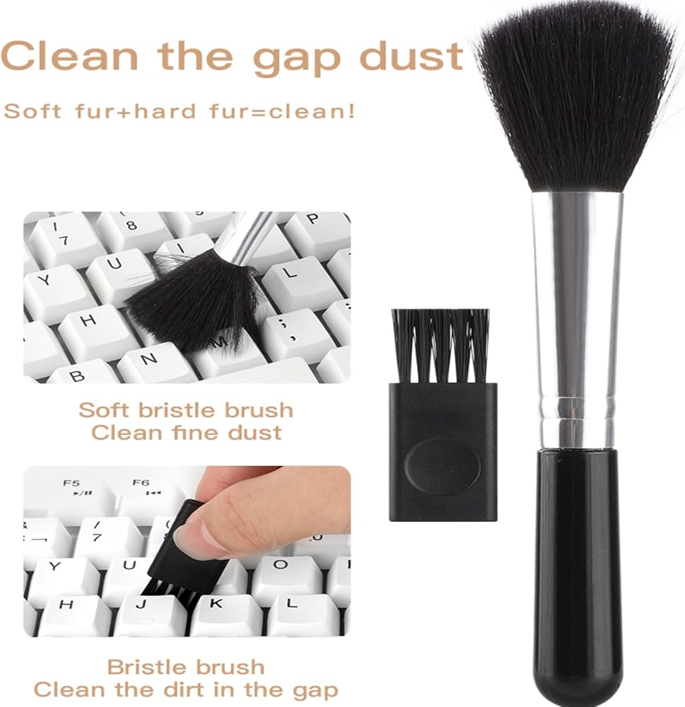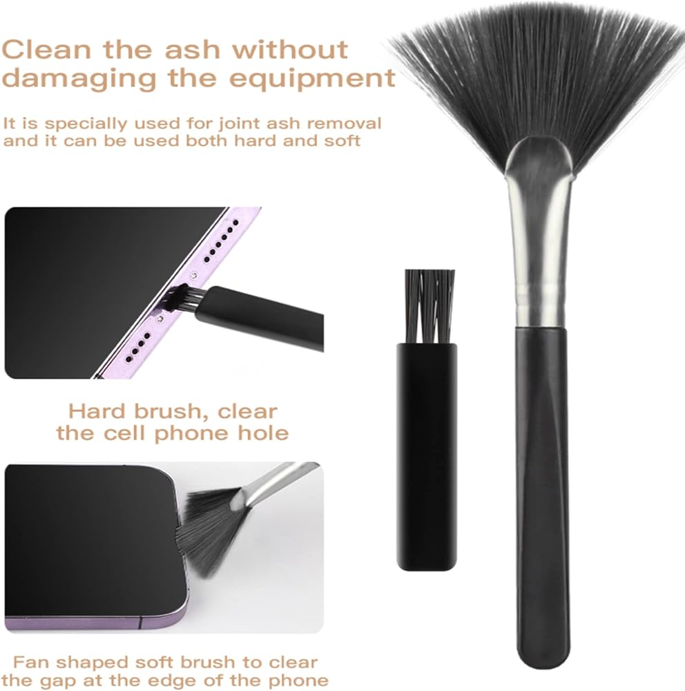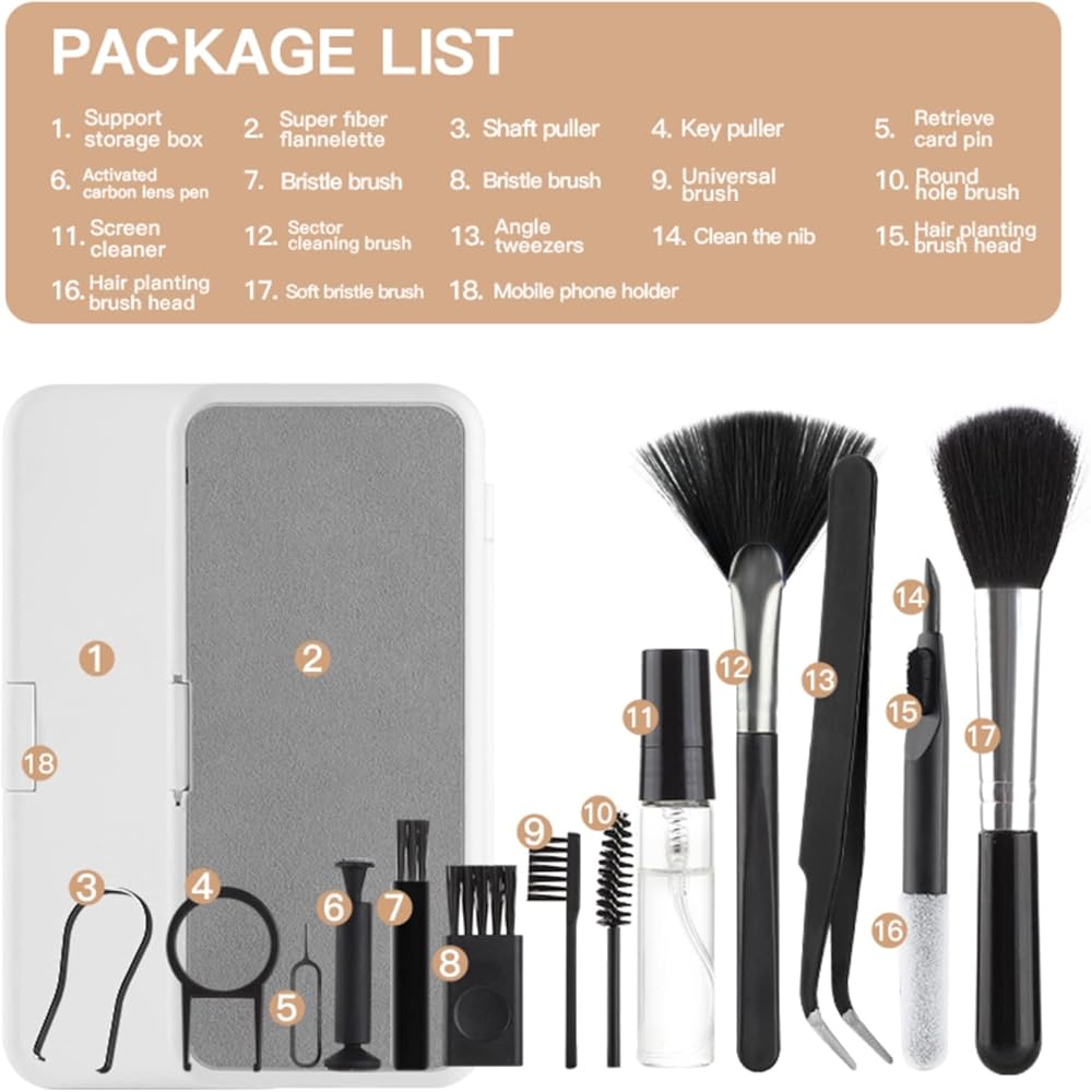 🌸18 in 1 Multifunctional Cleaner Kit: Electronic cleaning kit includes a cleaning pen for Earbuds with silicone tip,1 bracket storage box, Microfiber flannel,high-density soft brush, fiber fleece swipe, keycap buckle, key puller,2 High-density brushes, soft brush, Laptop Screen, Retrieve card pin, Active carbon lens pen, Cleaning cotton brush, Fan-shaped cleaning brush, Screen cleaner brush, Angle tweezers. 🎧Computer Cleaning Kit: Clean up the earwax in the gap of the earphone, and to clean the charging case, The Keycap puller easily pulls the keycap off, the high-density brush is large and sturdy enough to easily clean keyboard crevices, with screen cleaning liquid, spray an appropriate amount of cleaning liquid on the screen, and then wipe the screen with fiber fleece swipe,One Cleaning Set can meet your different cleaning needs. ⌨: Multipurpose use: Everyone needs to clean their electronics, (electronics cleaner kit)suitable for most wireless Bluetooth, cameras, digital products, keyboards, car interiors, car vents, printers, phones, calculators, speakers, TVs, computers in the market And other home and office appliances, soft brush set keeps your electronics clean and prolongs the life of your electronics. 🧹Mini version: This 18-in-1 electronic cleaning kit is super compact, easy to carry around, and extremely versatile. The laptop cleaning kit is good news for people who have used computers for many years. It can clean computers, that is, electronic equipment, and computer keyboards that cannot be cleaned. Dust, wax, and dirt make them clean and tidy. 💝 Keyboard Cleaning Kit: Keycap puller can pull out keycaps for easy cleaning and shaft puller can help replace damaged bearings. Metal head for cleaning crevice stains, high-density brush for earbuds and phone mesh sound hole, flocked sponge for cleaning earbud charging case hole.