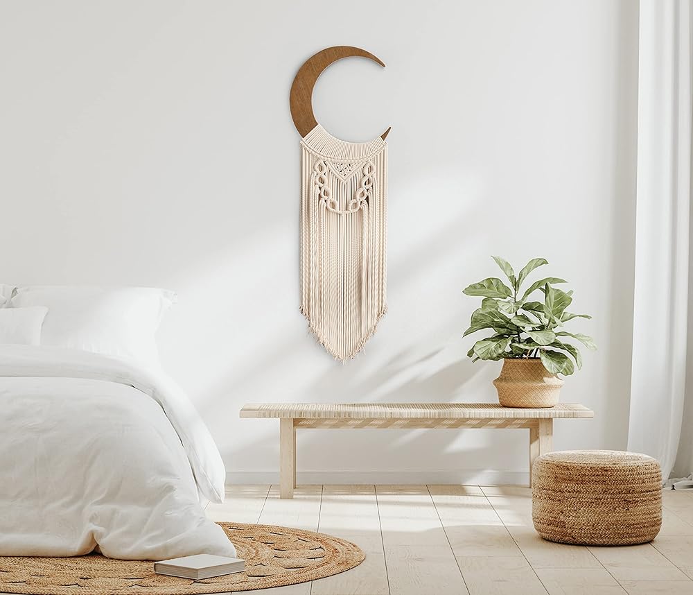 • 🌙 ديكور غرفة إيندي - اعرض العناصر العضوية لأجواء بوهو الأنيقة. هذه المكرمية الفريدة من نوعها على شكل قمر متعددة الاستخدامات لجميع الديكورات المختلفة: بوهو، ريفي، معاصر وأكثر من ذلك.