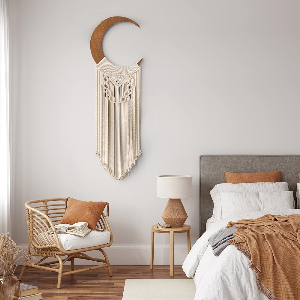 • 🌙 مظهر بوهو رائع - هل أنت مستعد لجعل غرفتك تبدو مثيرة للإعجاب؟ اعرض مكرمية هلال على الطراز البوهيمي الجميل كعمل فني مذهل.