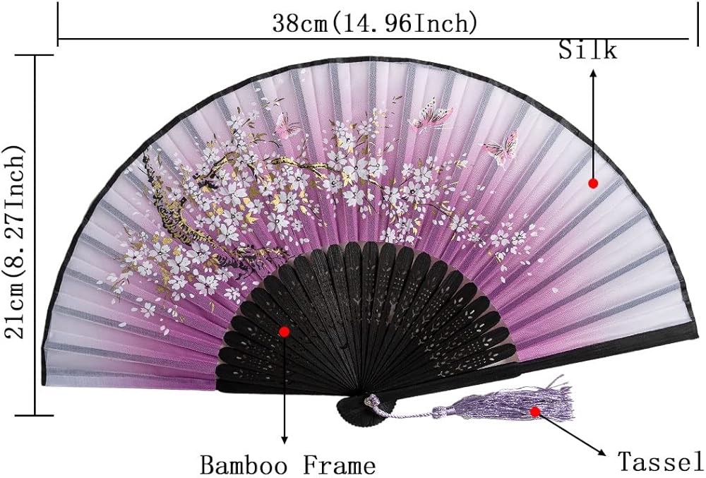 التصميم: تتميز المروحة بتصميم صيني وياباني تقليدي جميل بألوان نابضة بالحياة وأنماط معقدة ستضيف لمسة غريبة إلى أي ملابس.