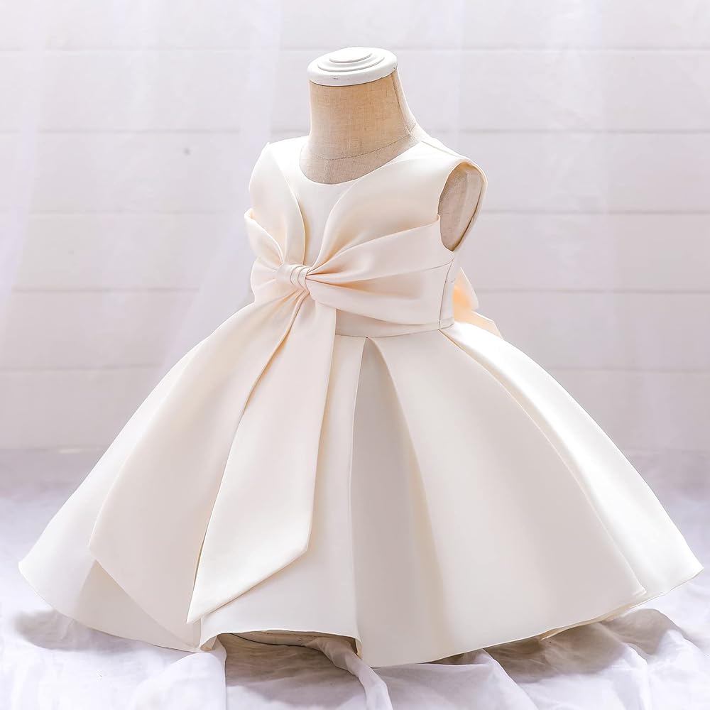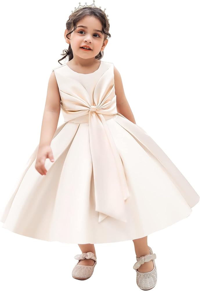 Kids baby girls satin dress with lovely bowknot princess gown wedding dress birthday party graceful dress.