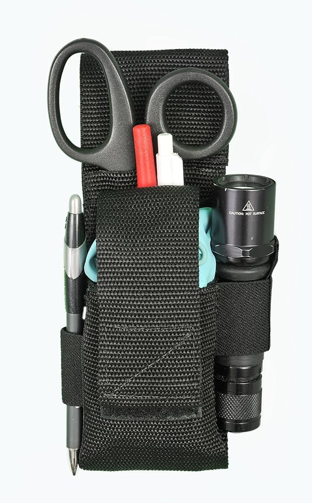 The Raine Large MOLLE EMT Pouch is a very hand tool case for home or in the field. Its ample 3" wide pockets hold a mini-flashlight, pen, multiple scissors or tools and large folding knifes or multi-tools. The case is made of "easy to care" and washable polypro webbing with very secure hook/loop closures. The adjustable belt loop fits up to 2.25" belts. Meets miltary IR specifications and made in USA.
