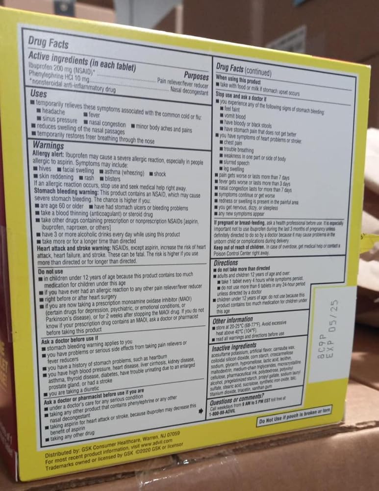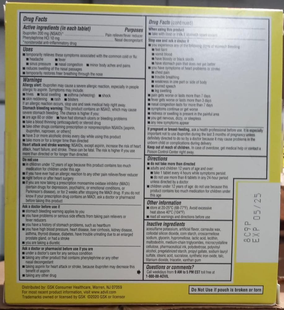 صندوق توزيع الألم واحتقان الجيوب الأنفية من Advil، 50 عبوة من قرص واحد مغلف (عبوة من قطعتين)