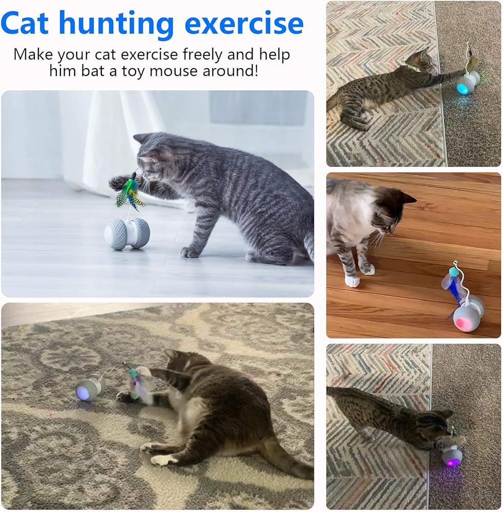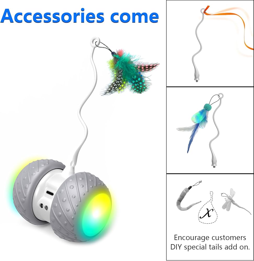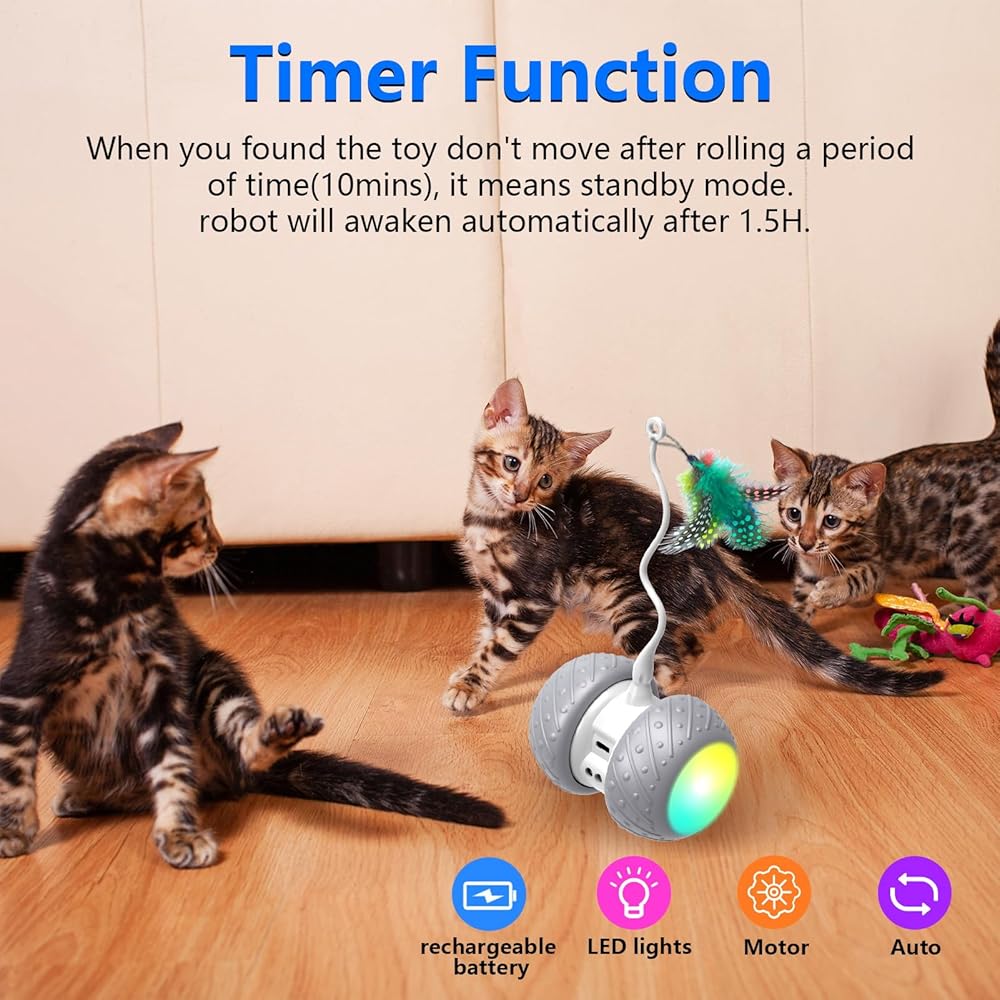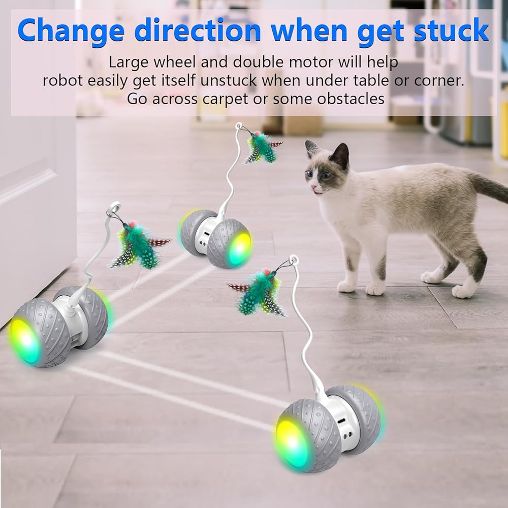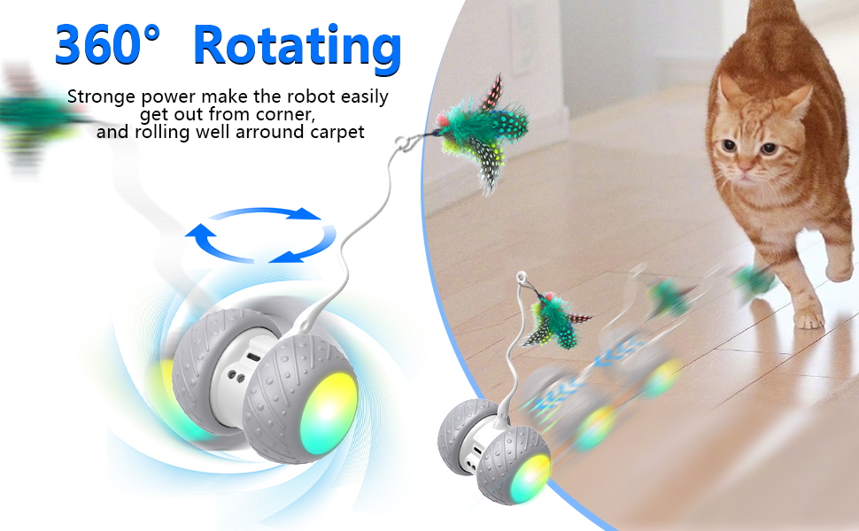 فك نفسها - - يمكن لألعاب القطط الكهربائية أن تنفك تحت الأرائك/الكراسي، ويتدحرج الروبوت ذو العجلة ويدور، ويدور عندما يعلق في الزاوية