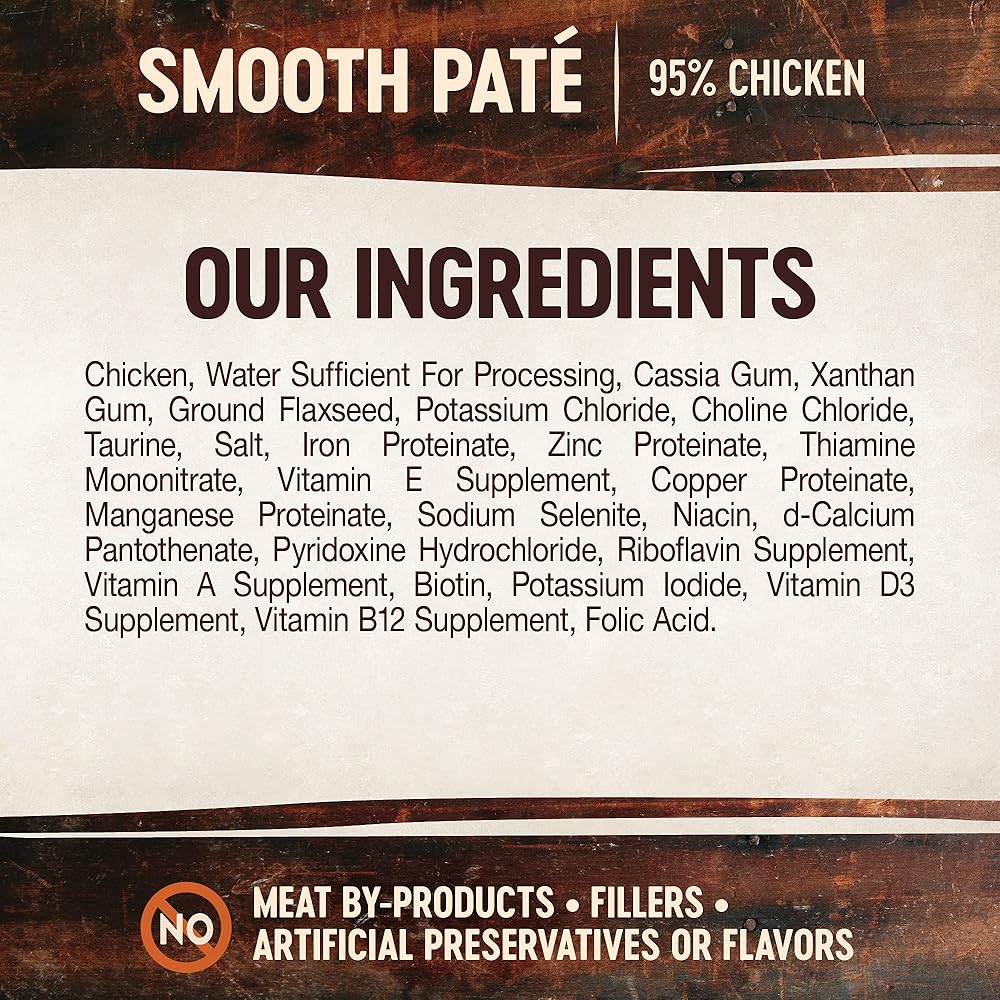 SMOOTH CHICKEN PATE: This natural, grain free recipe features 95% Chicken for a complete, balanced nutrition. Pate is completely smooth for an irresistible taste your cat will love.