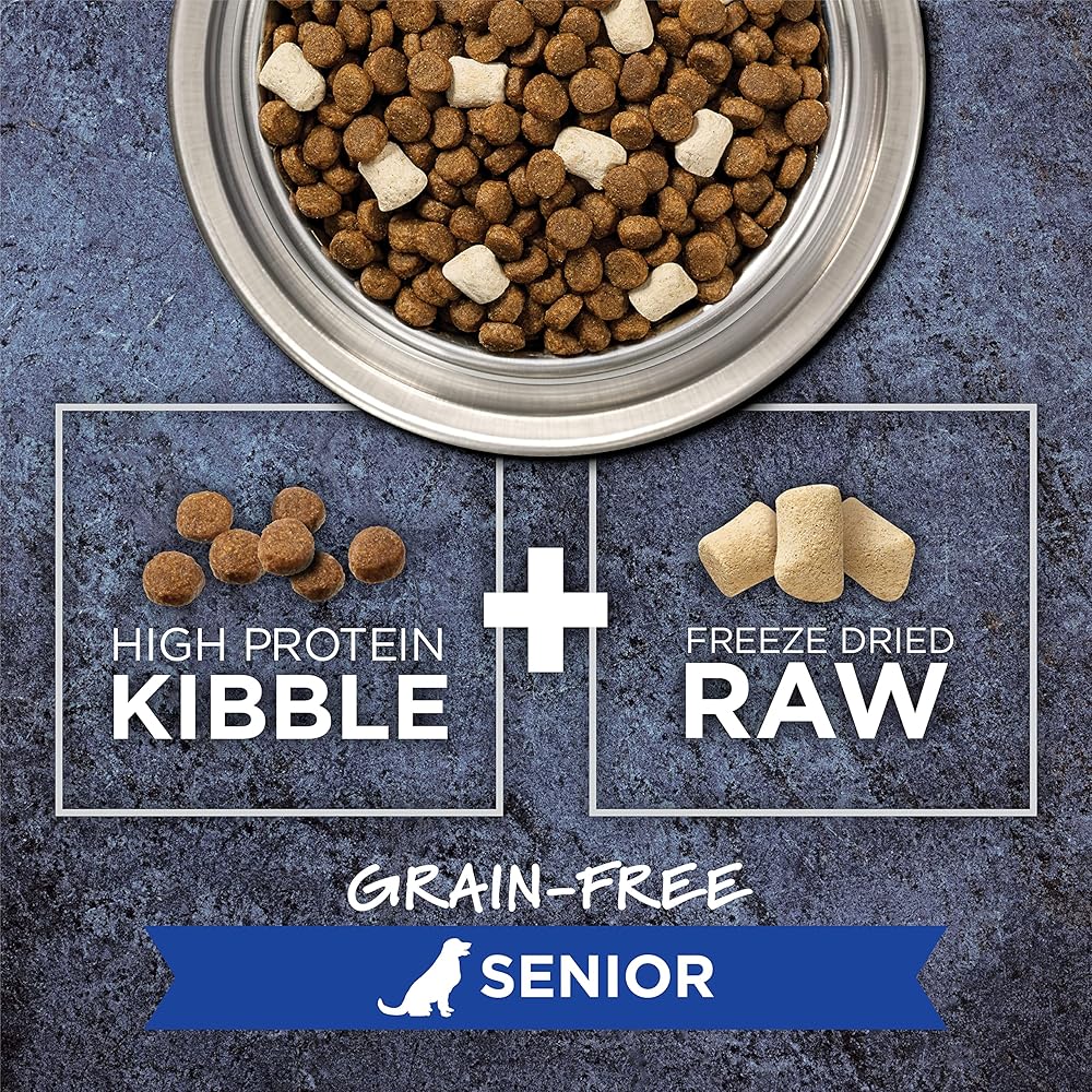 • SENIOR DOG FOOD PLUS FREEZE DRIED RAW PIECES: Made with natural DHA for brain and eye health, plus glucosamine chondroitin for hip and joint health. Made without grain, potato, corn, wheat, soy, by product meal, artificial colors or preservatives.