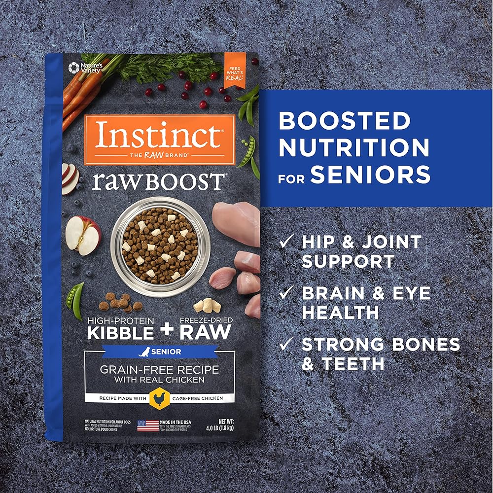 • GRAIN FREE SENIOR DOG FOOD WITH FREEZE DRIED RAW CAGE FREE CHICKEN: Instinct Raw Boost dry dog food combines high protein, grain free kibble with all natural bites of freeze dried raw chicken. Made with cage free chicken, probiotics and omegas.