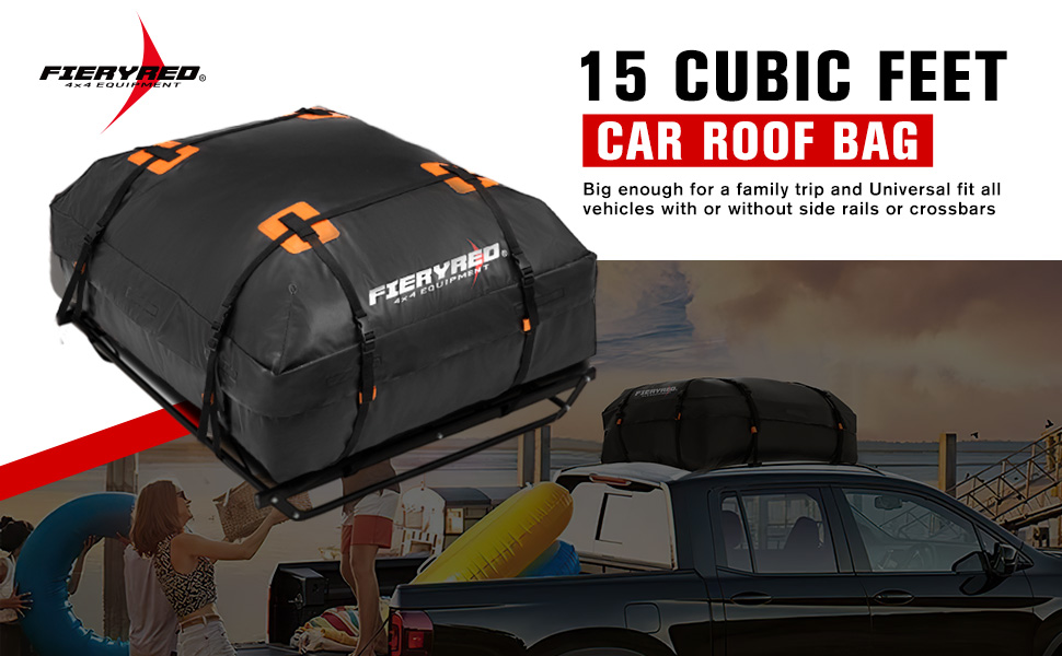 FieryRed Car Roof Bag Cargo Carrier - 15 قدم مكعب حقيبة أمتعة مقاومة للماء على السطح مع حصيرة مضادة للانزلاق، حقيبة تخزين الأمتعة للسفر ذات هيكل ناعم لجميع المركبات مع أو بدون رف