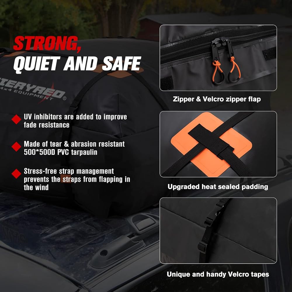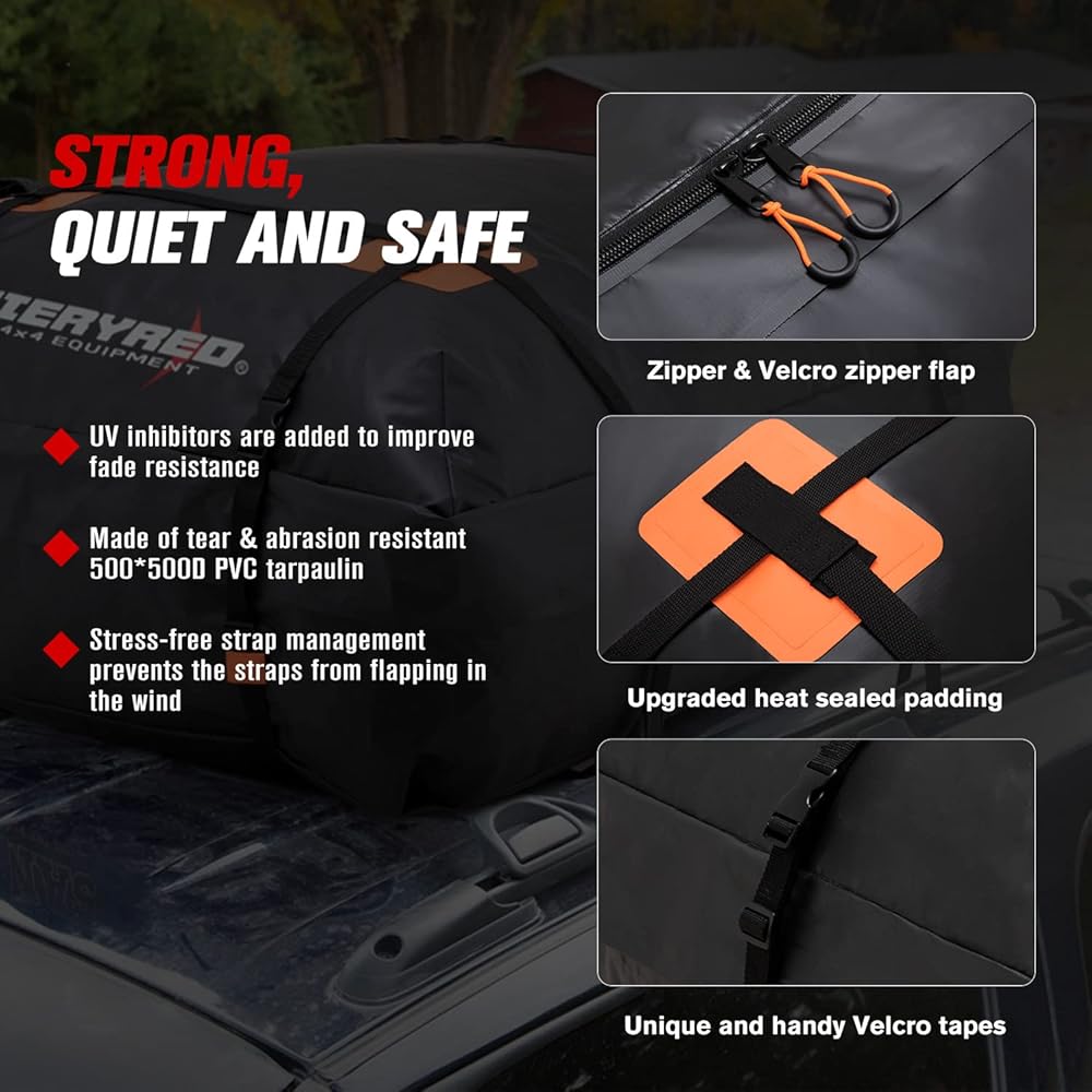 【حماية مقاومة للماء IP65】بفضل السحاب القوي وغطاء سحاب فيلكرو عريض مع خياطة قوية وتقنية لحام متعددة لما يصل إلى 4 طبقات، فإن حقيبة سقف السيارة FIERYRED هذه مقاومة للماء بدرجة IP65 لمنع الرطوبة.