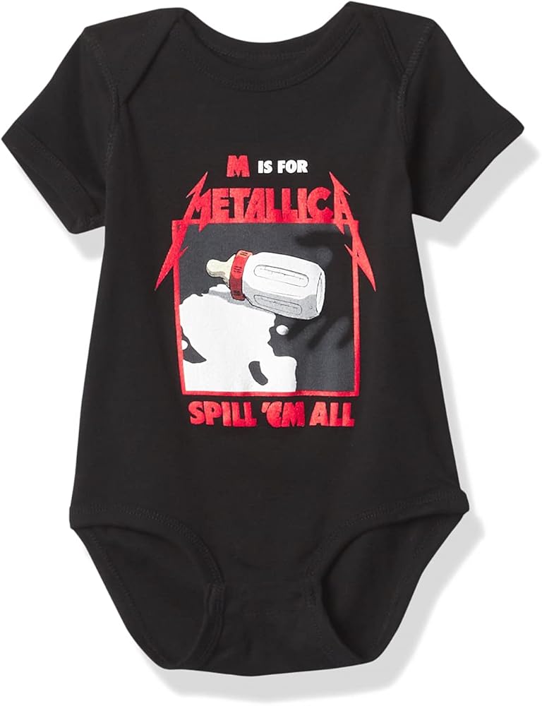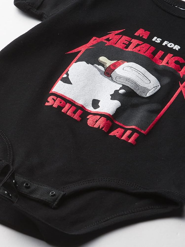 Black onesie featuring Spill 'Em All graphic underneath Metallica logo on front.