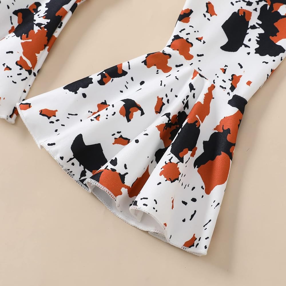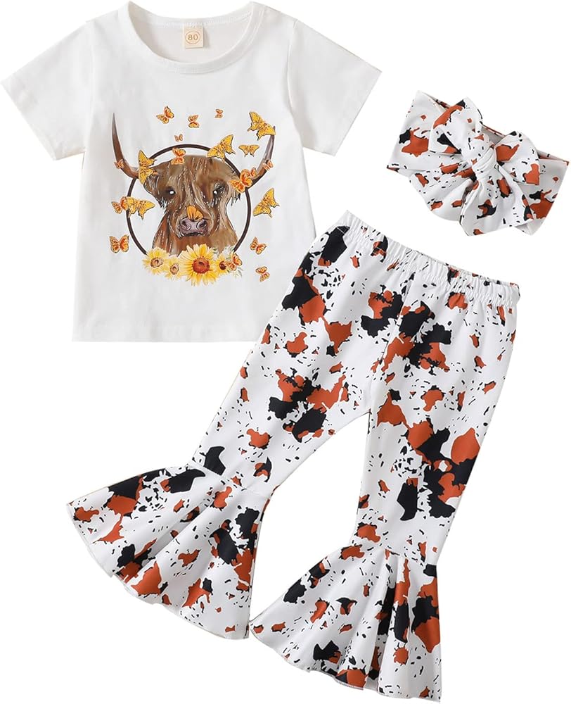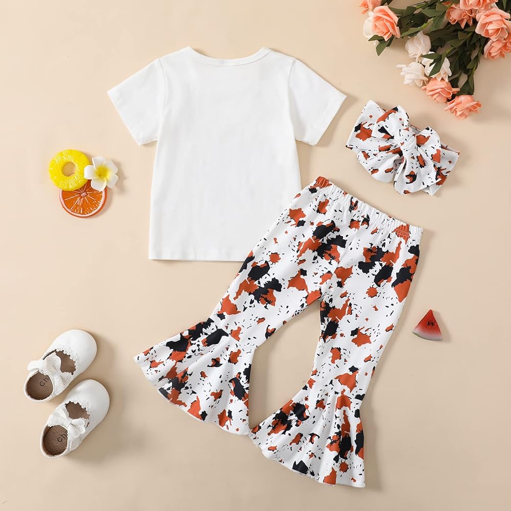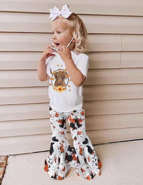 ✭ تصميم لطيف: قميص علوي بأحرف قصيرة الأكمام، نمط أبقار أو حروف، سراويل طويلة متوهجة بالورود أو الأبقار، مجموعة سراويل سفلية على شكل جرس للفتيات الصغيرات، مجموعة ملابس مكونة من قطعتين تجعل أطفالك يبدون أنيقين وجميلين.