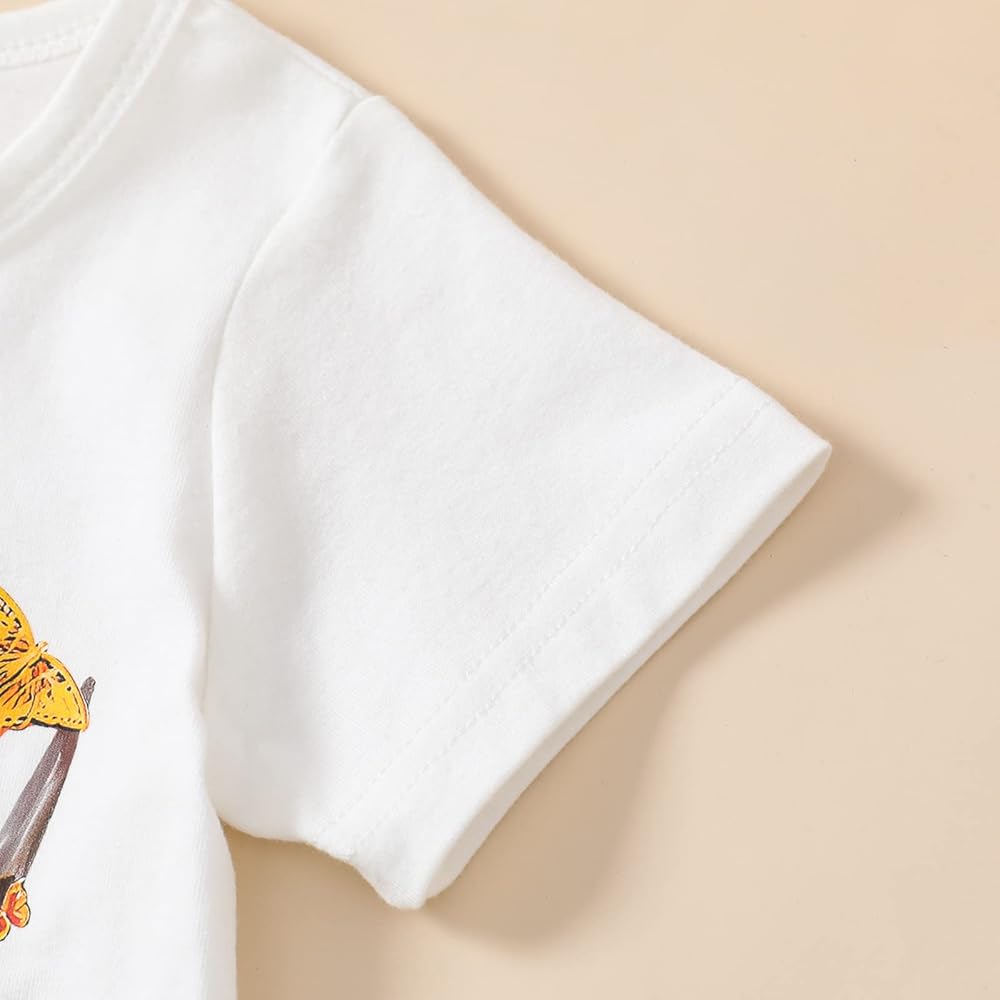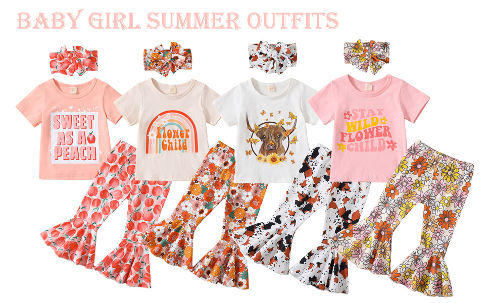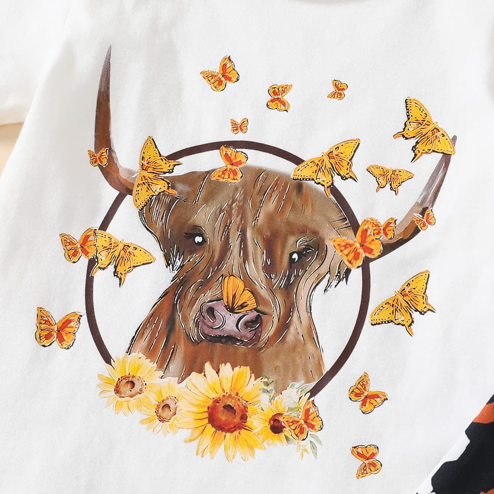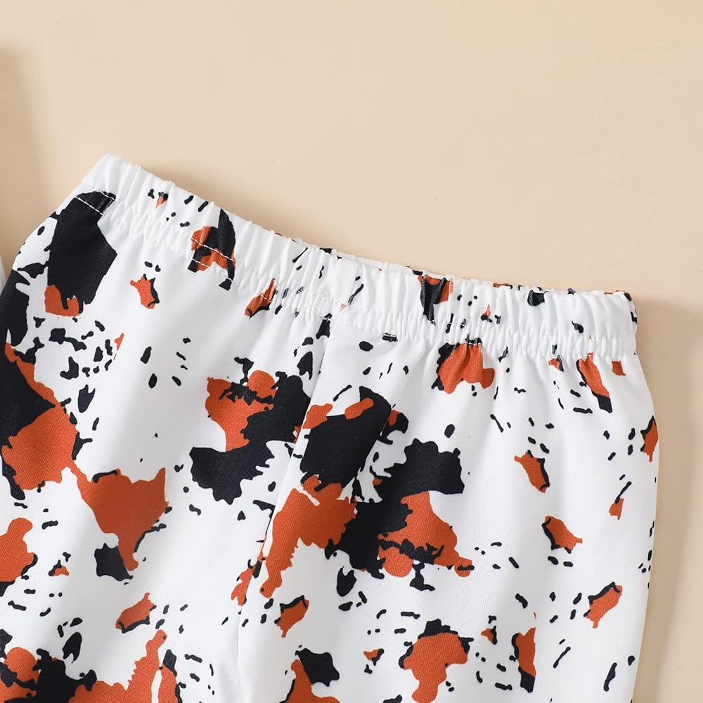 ✭ تصميم لطيف: قميص علوي بأحرف قصيرة الأكمام، نمط أبقار أو حروف، سراويل طويلة متوهجة بالورود أو الأبقار، مجموعة سراويل سفلية على شكل جرس للفتيات الصغيرات، مجموعة ملابس مكونة من قطعتين تجعل أطفالك يبدون أنيقين وجميلين.