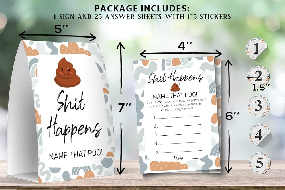 1 تسجيل دخول 5 × 7 انش و25 ورقة إجابة بمقاس 4 × 6 انش مع 1~5 ملصقات بمقاس 1.5 انش. ورق عالي الجودة، طباعة ملونة عالية الجودة، ملصق قابل للتكرار. تحتاج إلى إعداد الحلوى والحفاضات. ملصق لربطه بالحفاضات، يستخدم لتحديد الحفاضات لتتماشى مع أوراق الإجابات. سيستمتع الضيوف بتخمين الحلوى التي تتطابق مع "البراز" في الحفاض للحصول على المزيد من الجوائز.