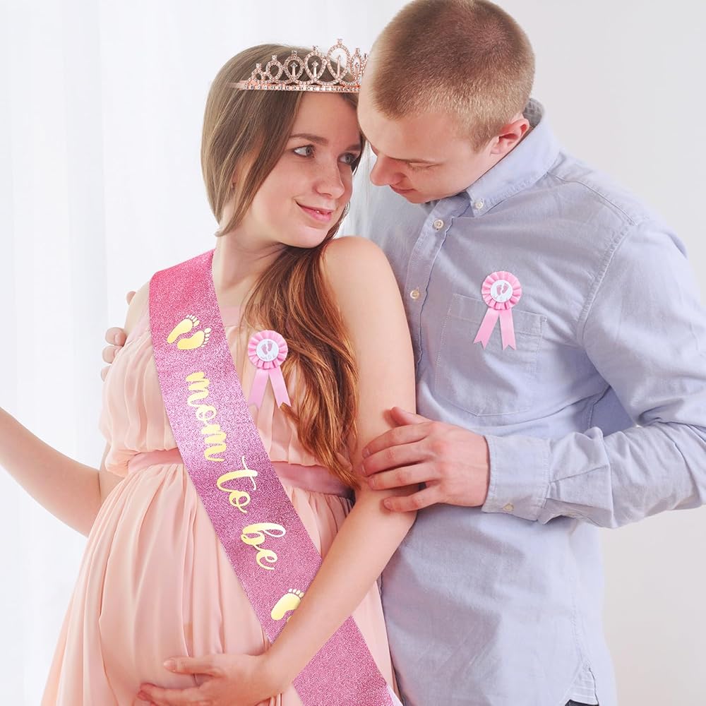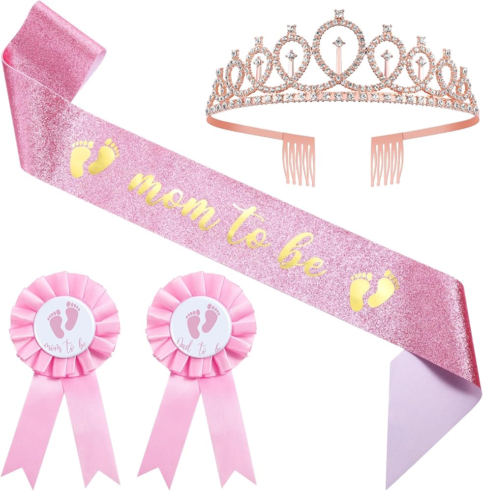 ريموولي مجموعة زينة حفلات استقبال المولود الجديد مكونة من 4 قطع من وشاح وتاج بلون زهري مطبوع عليه عبارة «Mom to Be » «Mom to Be»، تاج لامع لحفلات استقبال المولود الجديد، تاج لامع للأم والأب ليكون وزر