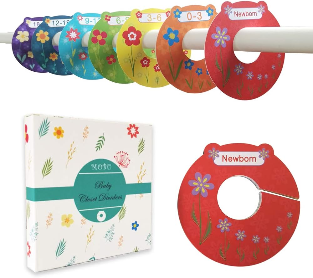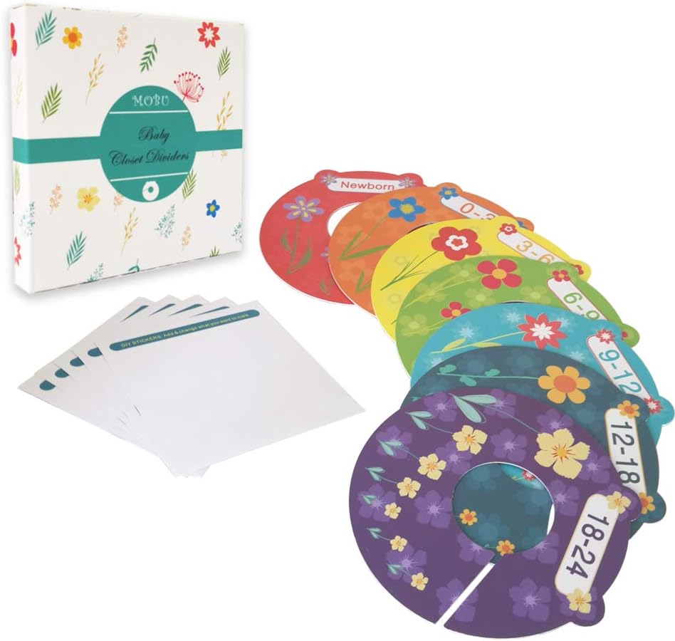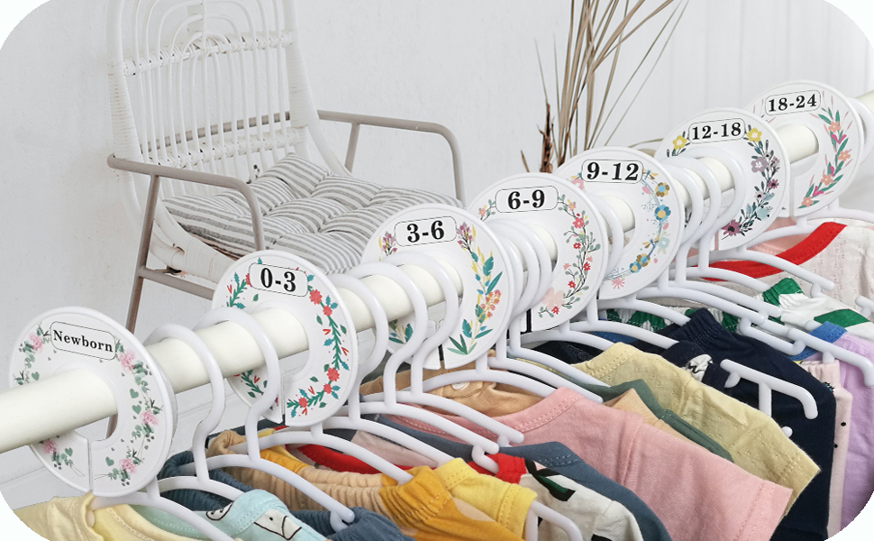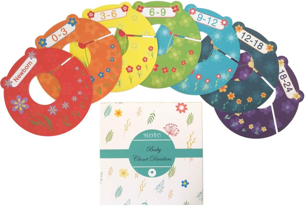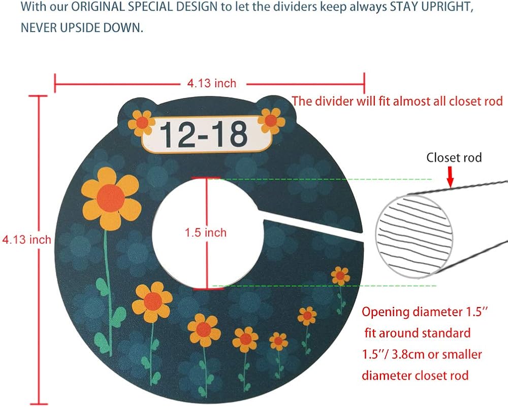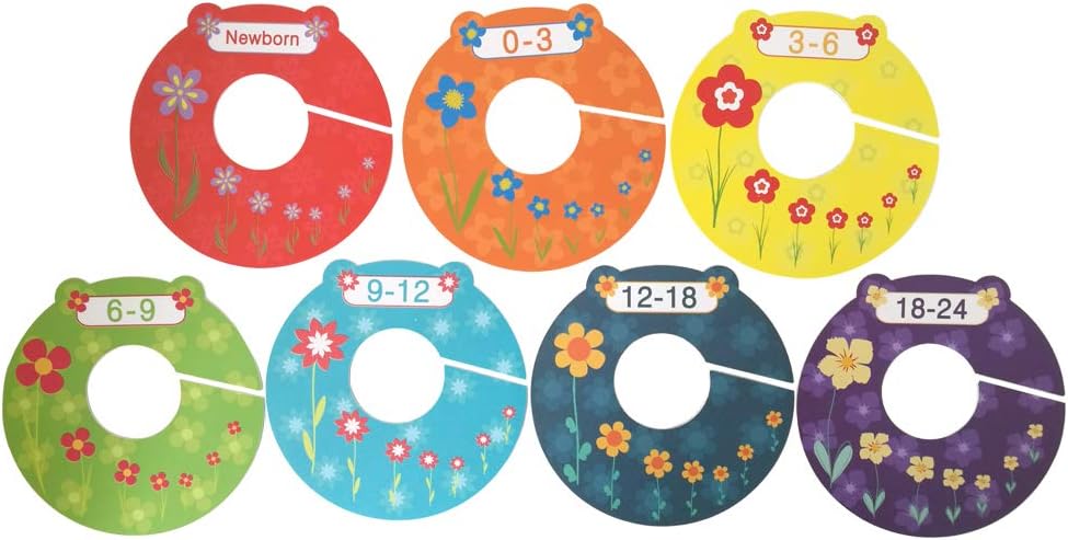 مجموعة من 7 قطع - فواصل حجم خزانة الأطفال مزدوجة الجانب، تصميم زهور أكثر متانة وجمالاً. تشمل: حديثي الولادة، 0-3، 3-6، 6-9، 9-12، 12-18، 18-24، تغطي وقت الطفل في أول عامين.
