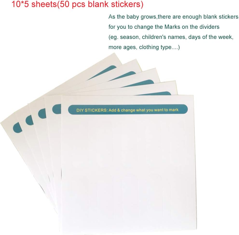 ملصقات فارغة إضافية (4*10 قطع/المجموعة) - ستدوم هذه المجموعة لفترة طويلة بسبب الخيارات المستمرة المتوفرة في المجموعة. مع نمو الطفل، يوجد ما يكفي من الملصقات الفارغة لتغيير العلامات الموجودة على الفواصل ( على سبيل المثال: الموسم، أسماء الأطفال، أيام الأسبوع، المزيد من الأعمار، نوع الملابس....)