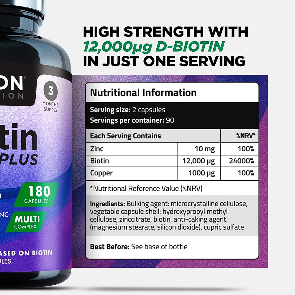 High-Strength Biotin (12,000mg per Serving) - 50% More Absorption with Natural d-biotin & zc-Boost Zinc & Copper Complex - Slow Release Delivery - 100% Vegan - Packaging May Vary